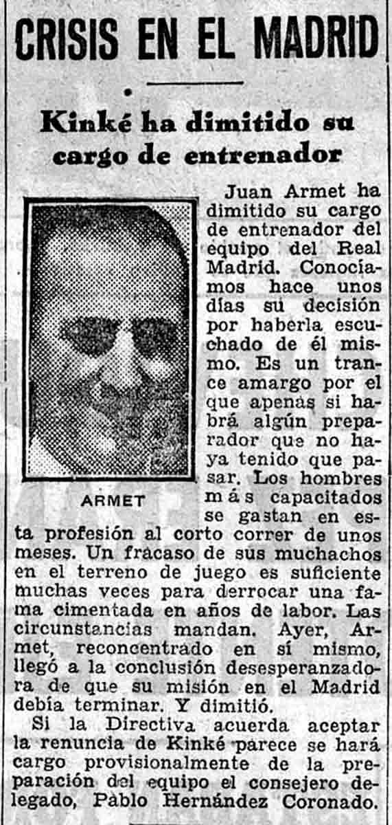 La contratación de Joan Armet ‘Kinké’ en el verano de 1941 como nuevo entrenador madridista fue inesperada y sorprendente para algunos aficionados