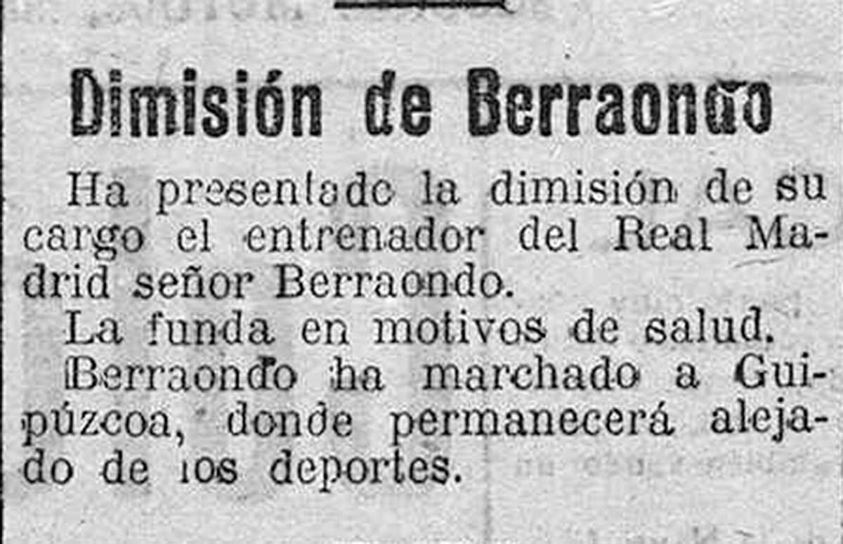 Tras el torneo olímpico Berraondo volvió a presentar su dimisión como seleccionador nacional y esta vez sí se la aceptaron. Parecía entonces que continuaría en la casa blanca y en septiembre se incorporaría a la pretemporada que hasta entonces dirigía Santiago Bernabéu. Sin embargo, a comienzos del mes de octubre saltó la noticia con la dimisión del técnico de forma irrevocable de su cargo como entrenador madridista. Los motivos aducidos es que se retiraba discretamente de la vida activa del fútbol y que lo hacía por motivos personales y de salud. Dejó la capital y se marchó a Hernani, donde residían sus familiares.