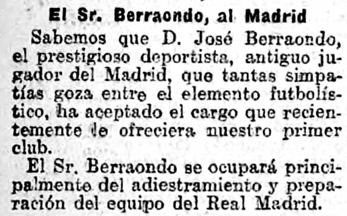 El propio entrenador escribió una pieza en Nuevo Mundo sobre la preparación de los jugadores de fútbol. En el artículo Berraondo explicaba que “ante el crecido número y la importancia de los partidos que se celebran, se ha hecho necesaria la intensificación de la preparación física de los jugadores. Estos han de adquirir la forma que se precisa para rendir el esfuerzo que exige la recargada temporada, poniendo especial cuidado en que las energías no se desgasten, pues el abuso trae consigo descenso de facultades, que influyen poderosamente en el juego de los futbolistas. Los entrenadores deben llevar sus vastos conocimientos, cada trainer tiene un sistema especial de preparación. La base principal es la práctica de aquellos ejercicios que produzcan la finalidad que se persigue. Los sprints, las carreras de velocidad, las carreras de fondo, los saltos de altura y en longitud, los de valles, los de cuerda y, finalmente, la gimnasia sueca, permiten que el jugador adquiera la velocidad, resistencia, agilidad y flexibilidad que requiere el juego rápido que hoy día se practica”. Hizo especial mención a la gimnasia sueca que “debiera ser en España ejercicio obligado en todos los Centros de enseñanza”. Por último, insistía en que “el estado de buena conservación física depende tanto de una vida ordenada como del mejor estado de preparación orgánica”.