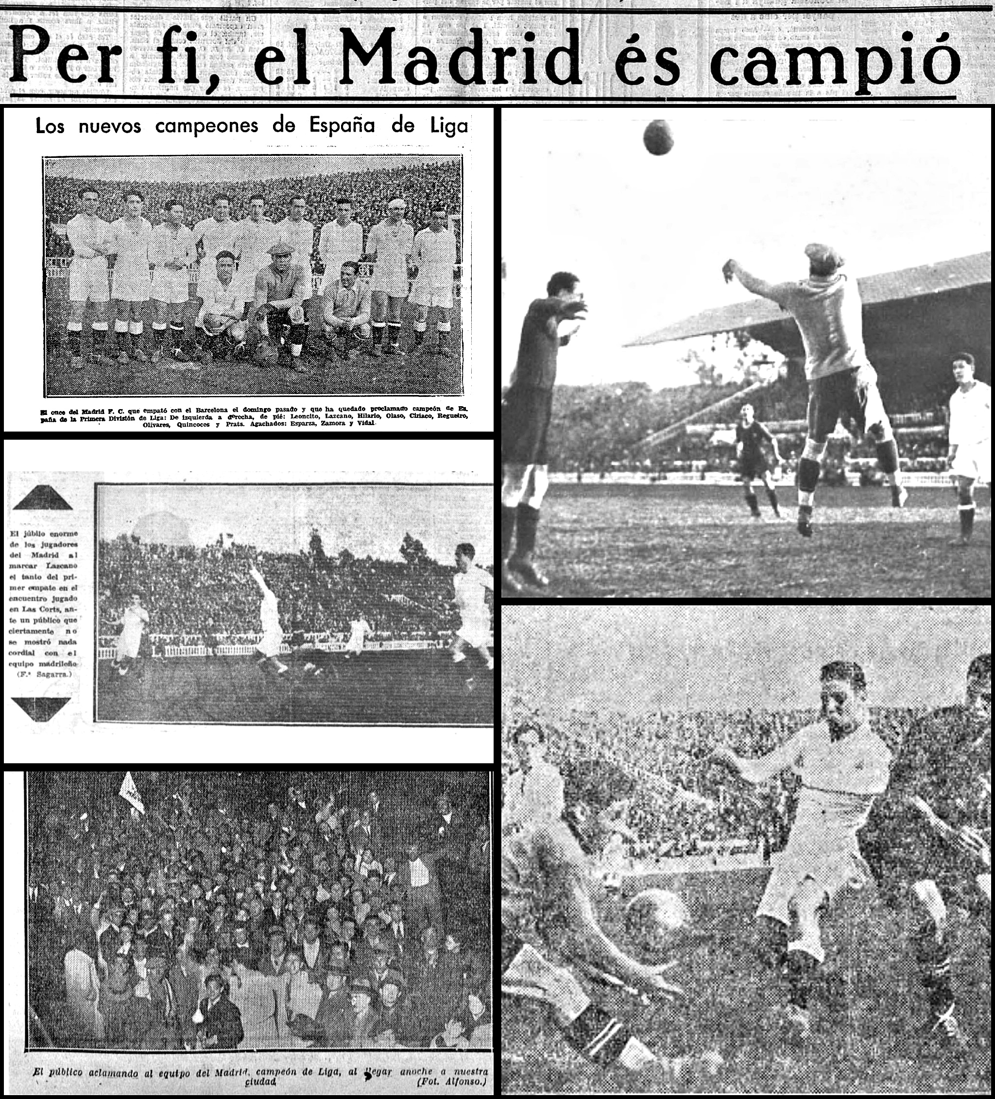 El estadio barcelonés registró un lleno hasta la bandera. El Madrid salió decidido a sentenciar el encuentro. Sin embargo, y pese al dominio inicial, marcaron primero los locales con un gol de Samitier. El título estaba en peligro, pero fue ahí donde el equipo de Hertzka demostró carácter, madurez y personalidad. Se hizo con el mando de la pelota y, antes del descanso, Lazcano con un gran disparo batió a Nogués. La labor arbitral no estaba gustando a ninguno de los dos bandos y protestaron muchas de las decisiones del señor Insausti. En la segunda parte, la tónica del choque fue bastante similar, con un Madrid que dominaba el juego y tenía el balón. El ataque por las bandas, con la velocidad de Lazcano y Olaso, causaba estragos en la zaga blaugrana. Atrás, el trío Zamora, Ciriaco y Quincoces detenía los intentos locales. Los blancos dieron un gran paso para el título cuando a falta de veinte minutos Luis Regueiro hizo el 1-2. Además, el Athletic perdía por dos goles en El Sardinero. Los culés evitaron la derrota con un tanto de penalti transformado por Arocha en otra señalización polémica del trencilla tolosarra. Quedaban tres minutos, pero la Liga no corrió peligro y los madridistas se proclamaron campeones en territorio culé. Además, lo hicieron sin conocer la derrota en toda la competición. La primera Liga blanca ya era una gloriosa realidad. Hertzka se mostró “tan contento que no encuentra pero alguno al emocionante choque”, según La Nación.