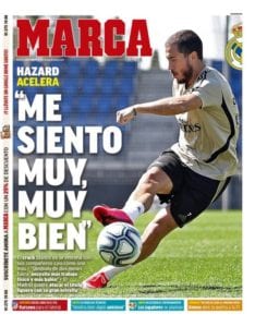 Subidos al monoplaza de Fernando huimos de la conmoción causada por Cyborgol y Felicirondo para refugiarnos en la portada de Marca donde Hazard acelera. El belga, superada su larga travesía a la despensa durante el confinamiento -lo dijo él, no nosotros- nos anuncia que se encuentra muy, muy bien. Nos felicitamos porque no haya pasado demasiado tiempo en el Edén de los bollos.