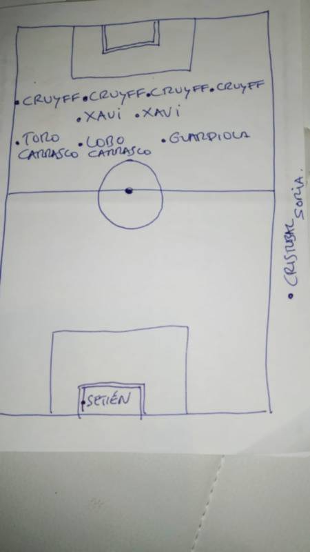 P: Veamos. Cruyff, Cruyff, Cruyff, Cruyff, Xavi, Xavi, Lobo Carrasco, Toro Carrasco, Cristobal Soria, Guardiola y Setién. ¿No queda un poco coja la defensa?