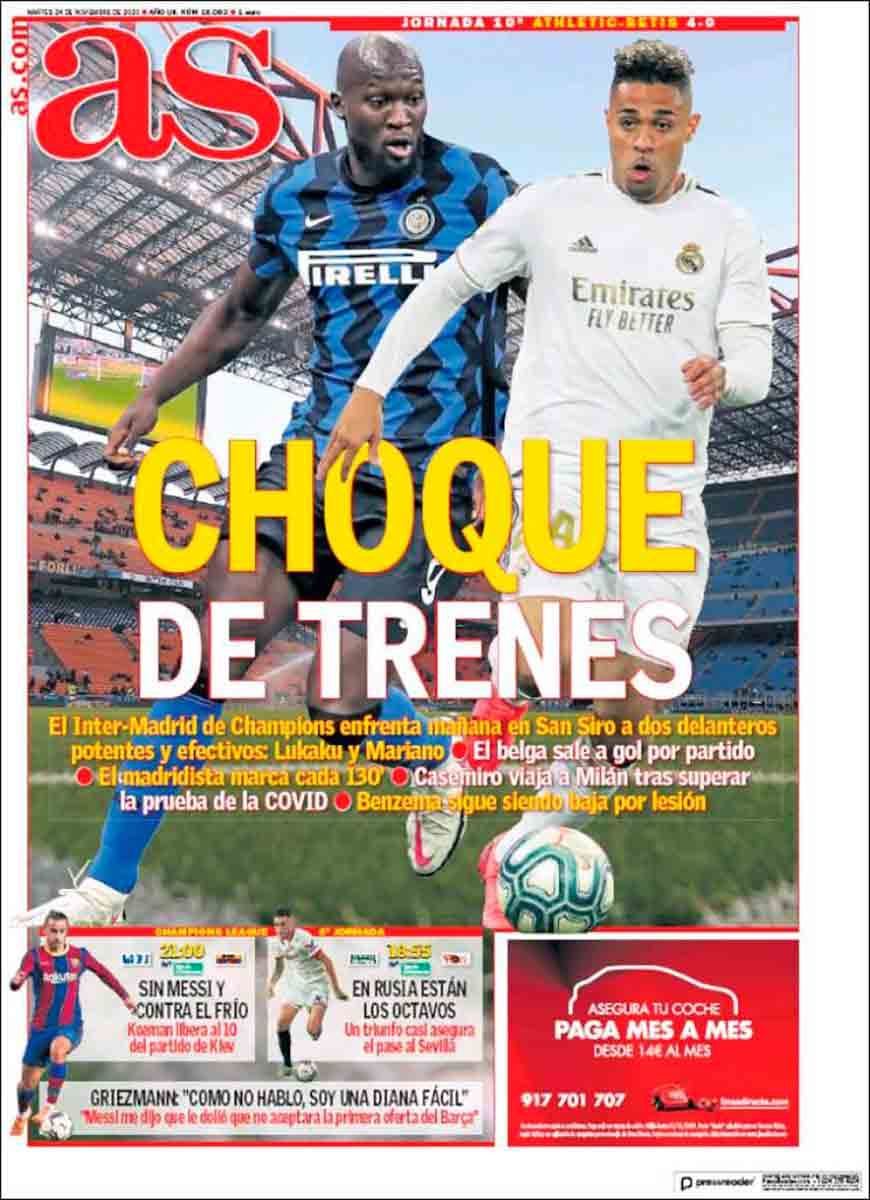 Os dejamos con la portada de As, que hoy nos trae un problema de esos que hacíamos en Física de 7º de EGB; si un tren sale de Cuenca el primer martes de la cuarta semana de un julio bisiesto y otro sale de Memphis al amanecer de un nuevo día, ¿cuándo se chocan el Milán? La respuesta es Mariano y Lukaku.