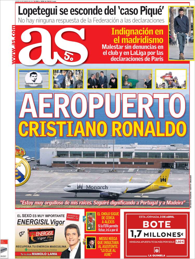 Al menos Marca, pese a no haberse quitado aún el complejo herniático de aquel "Apoteósico", trae el esperpento a portada. No así As, que camufla la indignación del madridismo con una primera plana fastuosa dedicada al Aeropuerto Cristiano Ronaldo de Madeira cuyo titular, por brillante, ingenioso, efectivo e impactante  será estudiado en los días venideros en las facultades de periodismo.