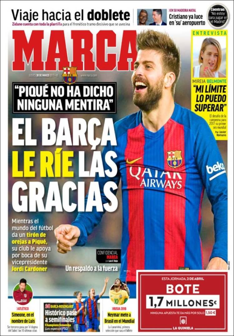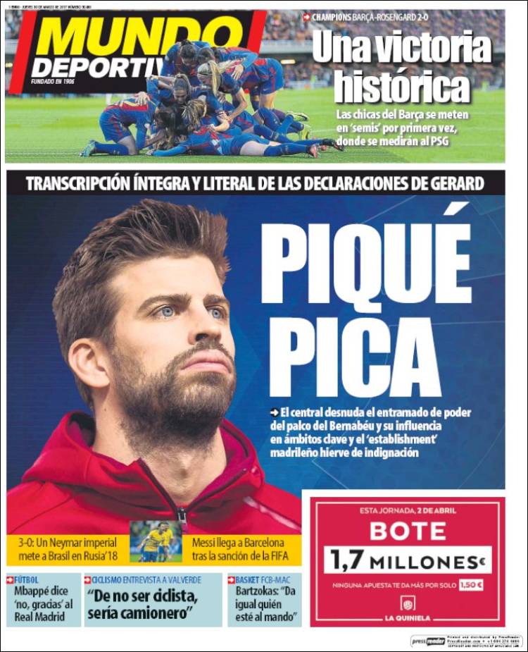 No dudo que en sus páginas interiores haya una transcripción íntegra y literal de las declaraciones de Gerard, como anuncian en portada. Pero también en ésta, Mundo Deportivo (no Piqué ni Cardoner) afirma que "El central desnuda el entramado de poder del palco del Bernabéu y su influencia en ámbitos clave".