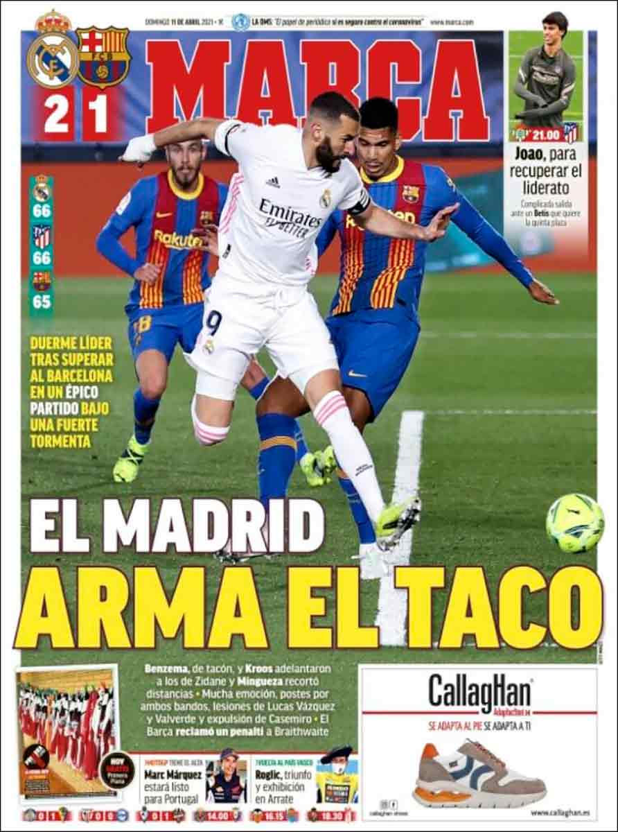 Es imposible recoger toda la belleza del gol de tacón anotado por Karim Benzema para abrir el marcador. El Madrid arma el taco, y Karim, el tacón. El galo nos tiene acostumbrados a regalarnos semana tras semana jugadas de enorme plasticidad, de una calidad técnica y belleza sin par, hasta el punto de que algún día contaremos a nuestros nietos que tuvimos la suerte de ver jugar a Karim Benzema con la misma vehemencia con la que los atléticos dirán que vieron jugar a Koke Resurrección. El Marca también hace referencia al “épico partido” jugado “bajo una fuerte tormenta”. El Madrid se abraza a la épica y el Barça a la típica… protesta: