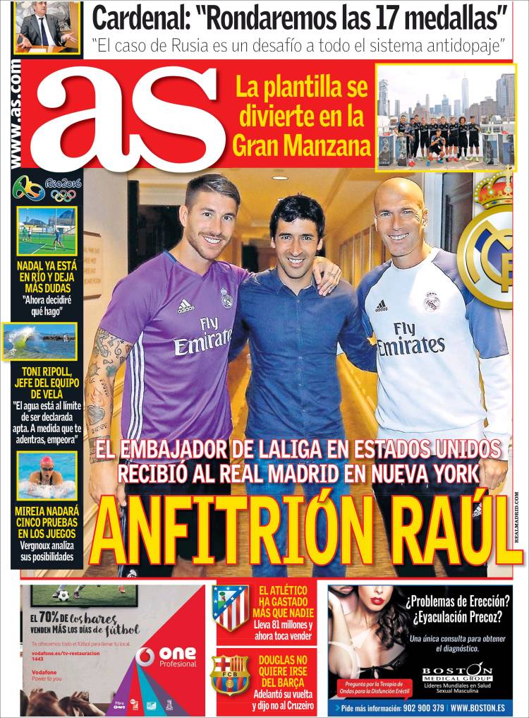 "Anfitrión Raúl", dice As bajo una foto del legendario 7 con nuestro entrenador y nuestro capitán, y no dice mal del todo porque es Raúl quien ha dado la bienvenida el equipo en su calidad de embajador de la Liga en dichas tierras. Raúl nos da la bienvenida en Nueva York pero sobre todo nos da la bienvenida en el umbral de nuestros recuerdos, otra vez el flashback. Cuánto cuidado hay que tener con los flashbacks, que edulcoran el interior de las remembranzas y nos pueden conducir a la falsa impresión de que cualquier tiempo pasado fue mejor cuando ya el propio Woody Allen desmintió a Jorge Manrique, por ejemplo en Midnight in Paris. Los buenos tiempos de Raúl fueron extraordinarios, pero estos no lo son menos por más que andemos sin ese director deportivo que Raúl dice añorar cuando le entrevista el propio As, acaso con la ingenuidad de quien ya no sigue la prensa española y no sabe hasta qué punto sus palabras van a ser retorcidas y/o magnificadas en perjuicio del club.