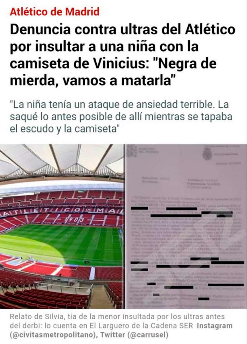 Érase una vez un club de fútbol que aún sigue permitiendo la presencia del grupo neonazi Frente Atlético, miembros del cual gritaron «Negra de mierda, vamos a matarla» a una niña que portaba la camiseta de Vinícius.
