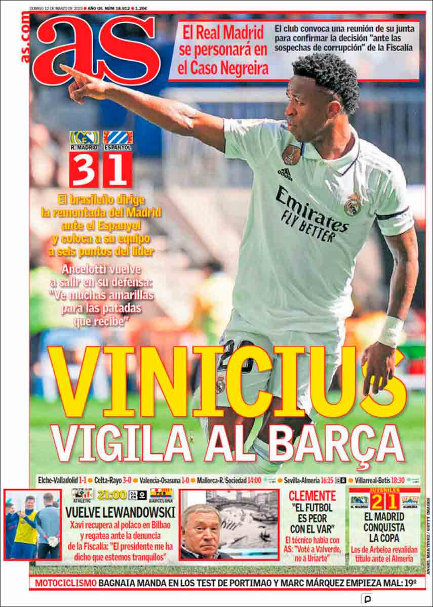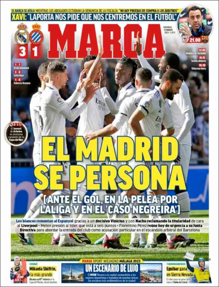 Juega con todo ello la portada de Marca, usando la acción de personarse tanto para resumir el partido citado como para avanzar la posible reacción del club ante la denuncia de Fiscalía al Barcelona. Supimos lo primero ayer y es probable que sepamos lo segundo hoy. Lo cierto es que, pese a que muchos miraban al club con cierta exigencia desesperada por estar demorando demasiado su respuesta al escándalo, se hace necesaria cierta frialdad para no dejarse llevar por los vertiginosos tiempos de la prensa y sí por los acompasados ritmos de la justicia. Solo esperamos que estos lentos compases no se conviertan en letanía y todo se agote, se dilate y se pierda como lágrimas en la lluvia.