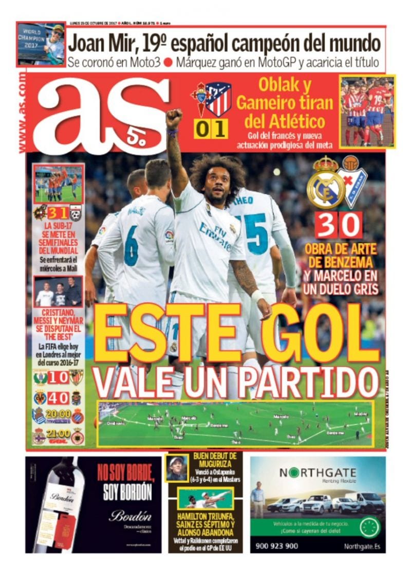 Tanto 'Marca' como 'AS' llevan a portada el extraordinario tercer gol del Real Madrid, un tanto en el que participaron casi todos. Benzema demostró su infinita clase, el equipo apoyó en una acción coral perfectamente ejecutada y Marcelo definió con maestría segundos antes de señalarse el escudo para recordarle al mundo que el Madrid sigue estando ahí. Elogia la prensa un gol, que no un partido ni una nueva victoria, pero algo es algo y no nos vamos a quejar ahora. Agradecemos que de vez en cuando digan algo bueno del equipo que viene ganando todo últimamente.