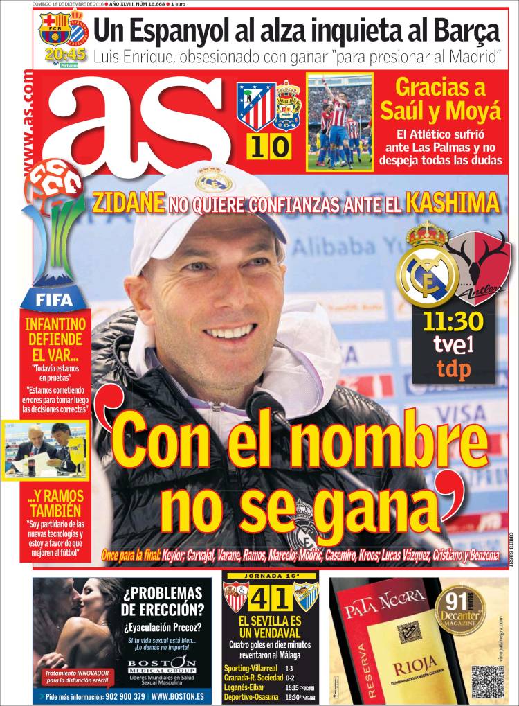 "No se gana con el nombre", advierte Zizou desde la portada de la Ouija, y con más razón que un santo. Se gana con el compromiso sin mácula de Cristiano (ese sí que distefanea y no Messi, querido Alfredo, ¿viste su papel en el gol de Benzema ante el América?); con la excelencia técnica del propio Karim; con la pujanza avant-garde y al mismo tiempo insultantemente tradicional de un extremo como Lucas Vázquez; con el tiovivo perfecto de un medio campo sobre el que bailan y combinan piezas de relojería incandescente como Luka, como Toni, como Casemiro; con el pavor que inspiran los goles que se organiza y come Ramos; con el fulgor desatado de Marcelo en la banda. Así se gana y así ganaremos mientras en Barcelona hablan de su derbi para no hablar de Japón, de Messi para no hablar de Japón, de Luis Suárez para no hablar de Japón, de abusos sexuales y a la vez de terapias para mantener la erección para no hablar de Japón, ¡del PSG! para no hablar de Japón. Hablan de tantas cosas para no hablar de Japón que se han quedado a un paso de hablar de Japón para no hablar de Japón. Pero, ¿y si dentro de unas horas (no lo quiera Dios) perdiera el Madrid? Ay, amics. Ay, enemics. Si dentro de unas horas perdiera el Madrid contra el Kashima, no existiría otra cosa que Japón para estos mismos rotativos.