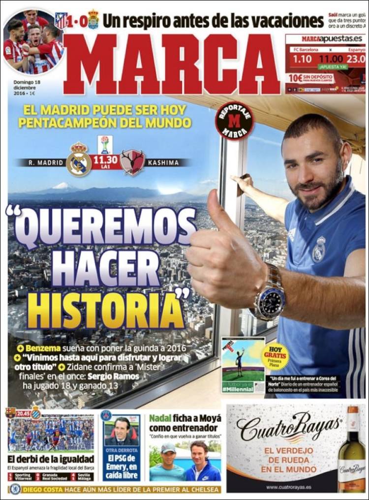Es oficioso (y es oficial) que no hay nadie mejor que nosotros, y aun así previene Karim al antimadridismo, desde la portada de Marca, que queremos seguir haciendo Historia, proclamándonos pentacampeones del Mundo. Para ello será necesario derrotar al sorprendente Kashima, el campeón japonés que contra todo pronóstico endosó en semifinales un rotundo 3-0 al Nacional colombiano. El campeón de Europa es por definición mejor que el campeón japonés, pero la belleza de esta competición (belleza e interés que se pone en entredicho única y exclusivamente cuando quien la disputa como campeón de Europa es el Madrid) consiste precisamente en que hoy la definición puede no valer. Hoy el campeón japonés tiene la oportunidad de ser mejor que el campeón de Europa. La mera opción de este sindiós, de esta cosa futbolísticamente antinatura, es lo que justifica la existencia de este torneo, que nosotros defenderemos como importante lo juegue quien lo juegue. La posibilidad de la subversión que consiste en que el campeón japonés puede ser el campeón del mundo si se lo gana y las circunstancias le son propicias: eso hace grande este torneo que dentro de pocas horas, si todo va bien, engrosará sin embargo las vitrinas del Madrid, ese lugar donde hay tantas copas como amantes furtivos en el armario de un vodevil. Y más que habrá, queridos amigos. Y más que habrá, queridos enemigos. Y más que habrá.