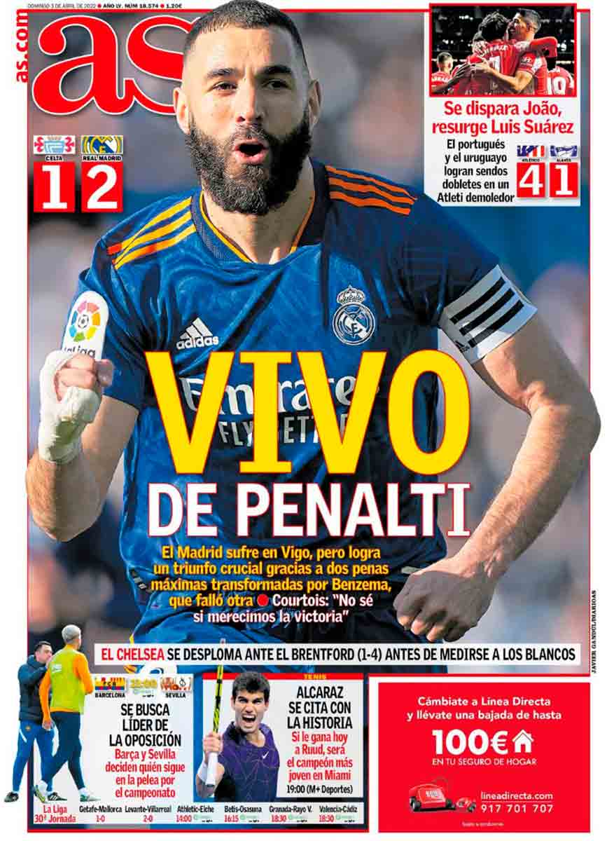 Marca, de entrada y en grande, titula: “Once metros más cerca de la Liga”. Después, en letra minúscula: “Decisivo triunfo blanco con doblete de Benzema al transformar dos de las tres penas máximas bien señaladas”. Como si quisieran contentar a todos. Pero resaltan lo que resaltan.