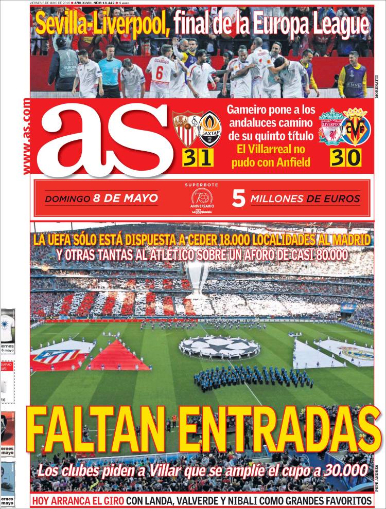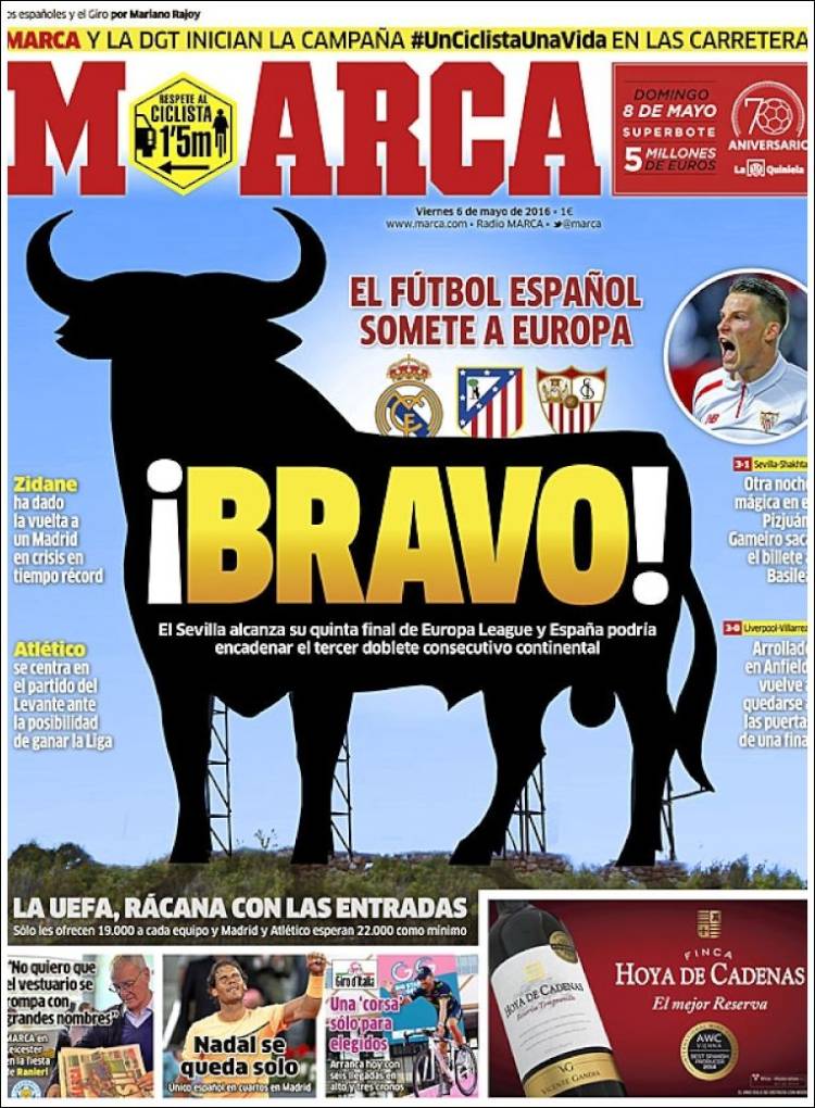 Es, sin duda, una portada cañí. Incluso inquietante. Así que imaginen qué hubiera sucedido si finalmente el Villarreal se suma a la fiesta de Real Madrid, Atlético y Sevilla -¿por cierto dónde anda el Barça?- imagínenselo. Ha puesto hoy tan alto el listón Marca que superarlo supondría regalar con el diario toro, torero y sevillana a depositar sobre el televisor de su casa, junto a un CD –o casete- con los Greatest Hits de Joselito, El Pequeño Ruiseñor.