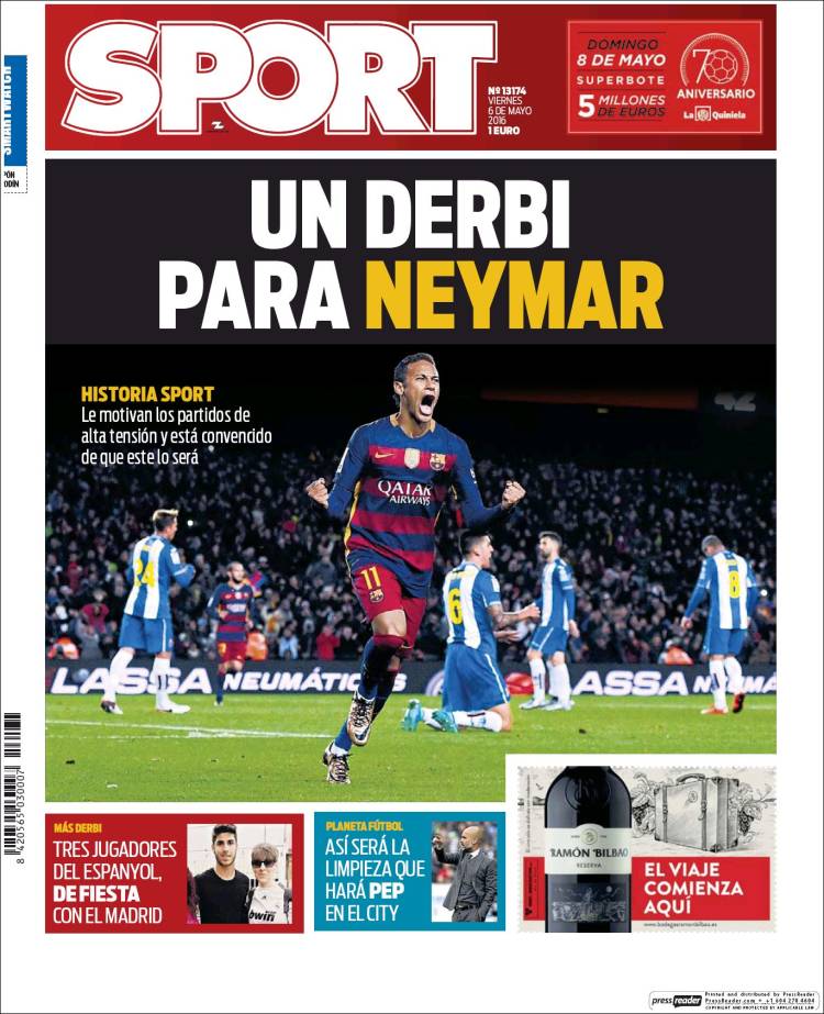 No se queda atrás en esto de la maledicencia Sport, aunque, eso sí, más enfocado al derbi contra el Espanyol, en el que el Barcelona se jugará la Liga con la sombra del Tamudazo en el recuerdo. Se afana el diario de Mascaró en practicar el tiro al perico al asegurar que tres futbolistas del Espanyol "se fueron de fiesta con el Madrid", entendiendo futbolista del Espanyol como futbolista del Espanyol cedido por el Madrid –Asensio y Burgui; el restante es el ex del Rayo, Robert Correa- y entendiendo fiesta como partido de vuelta de las semifinales de la Champions en el Bernabéu.