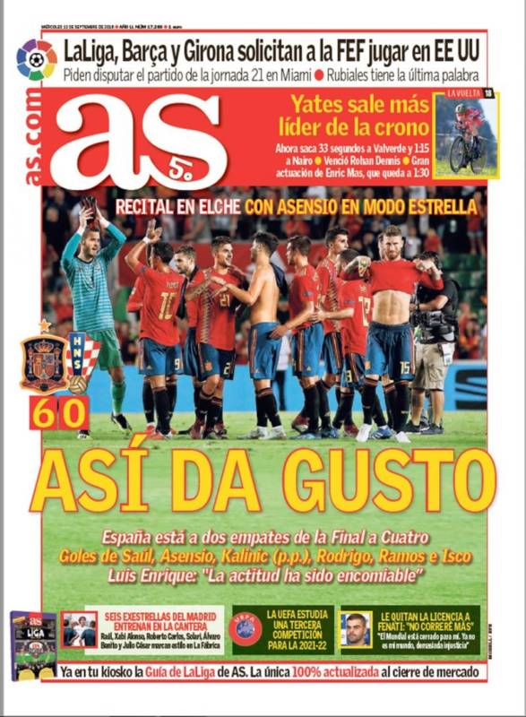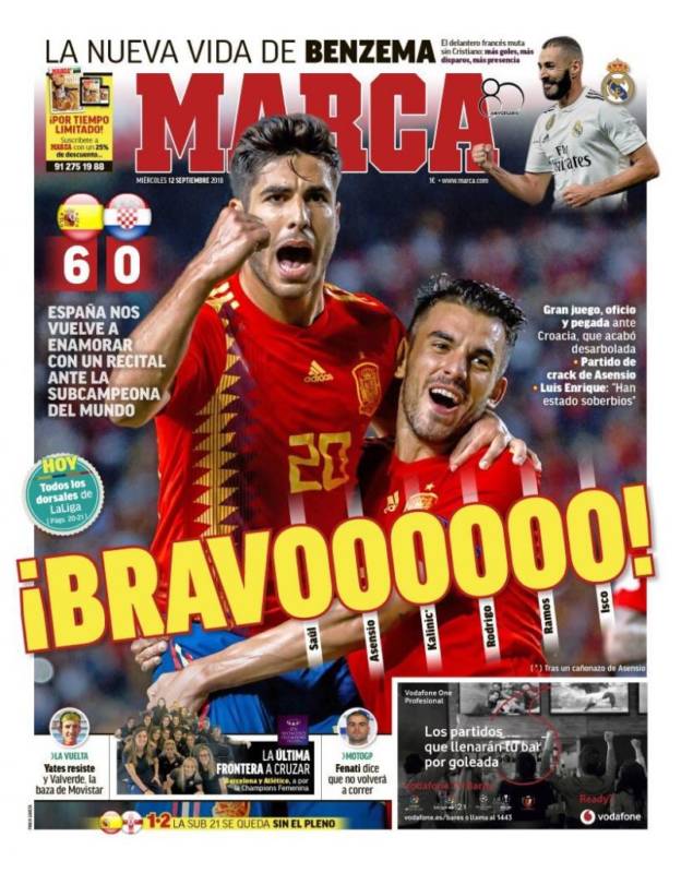 Ayer, ante Croacia, brillaron Isco, Ceballos, Carvajal, Sergio Ramos, Nacho y, sobre todo, Marco Asensio. Todos ellos envueltos por un estilo similar al que tiene el Real Madrid, mezclando posesión de balón con agresividad y verticalidad. El problema es que en 2018 ya no se lleva eso de las comparaciones. Qué lástima. Siempre llegamos tarde...