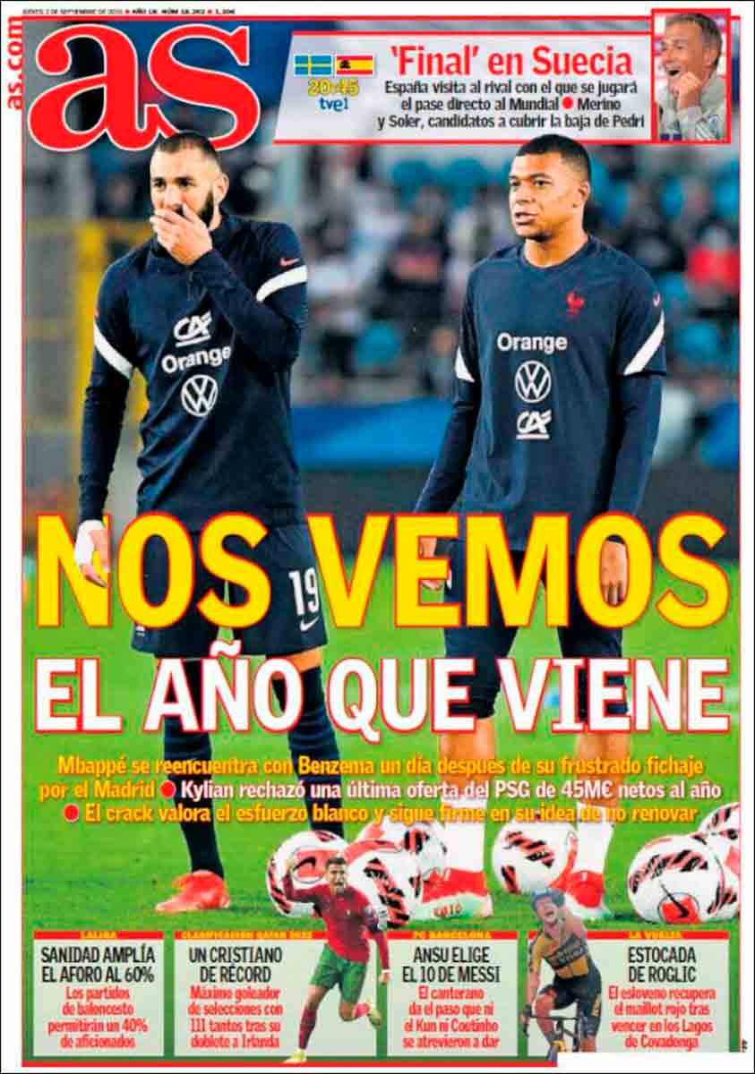 As se centra en el futuro (con lo que sigue anclado en el pasado mercado de fichajes) y su titular emplaza al futuro enlace entre Real Madrid y Kylian Mbappé. Destacan que ha rechazado una última oferta de 45 millones de euros netos para renovar con el PSG.