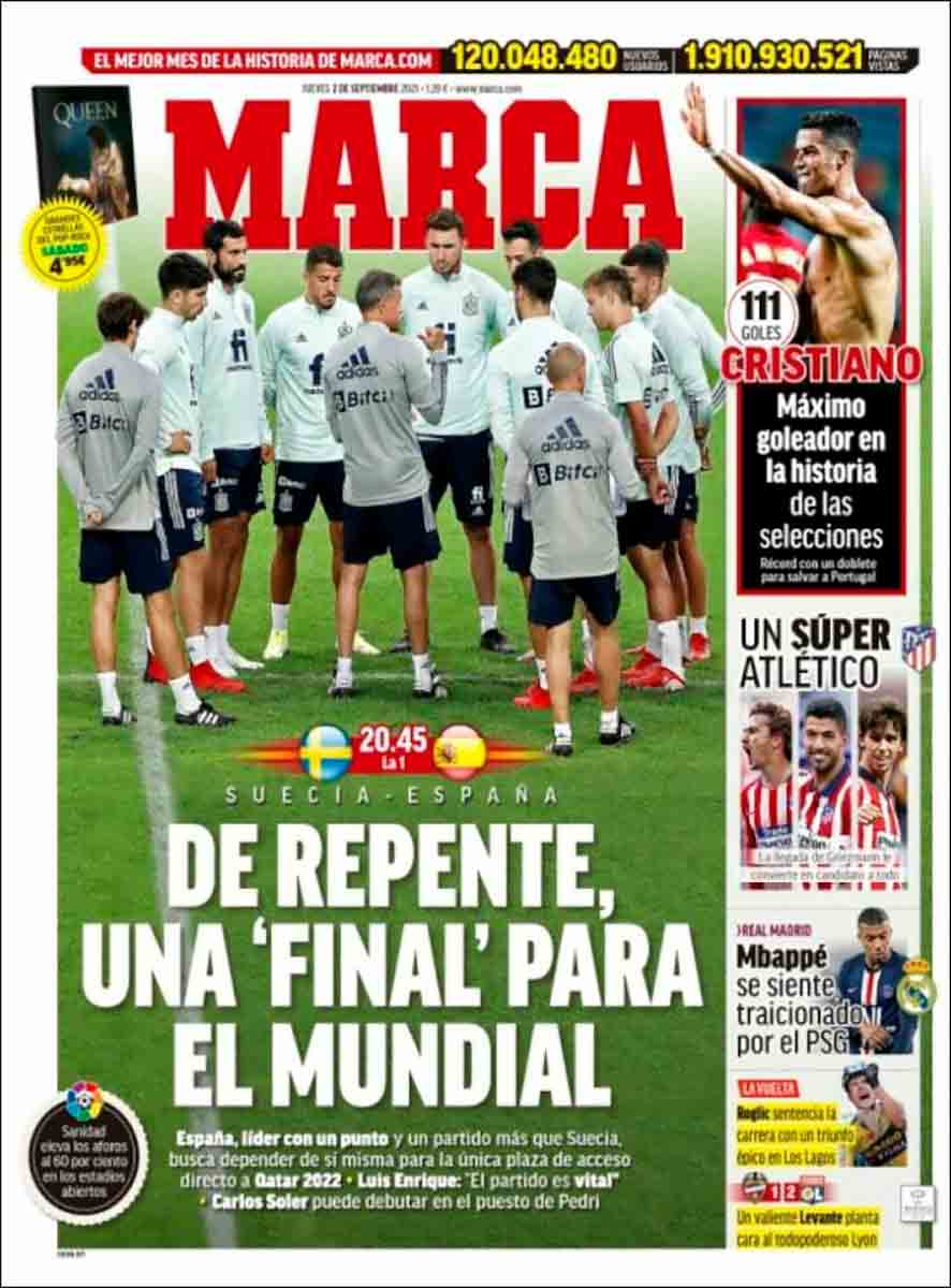 Marca se centra en el presente, y el hoy es un maldito partido de la selección española. Al parecer es una «final» para el mundial, para el mundial de Catar 2022. Todo está relacionado. Un mundial organizado sobre el soborno de su elección y sobre numerosas vidas humanas perdidas en la construcción de las infraestructuras necesarias que han sido convenientemente tapadas por el propio Catar con esa exposición de estrellas llamada PSG.