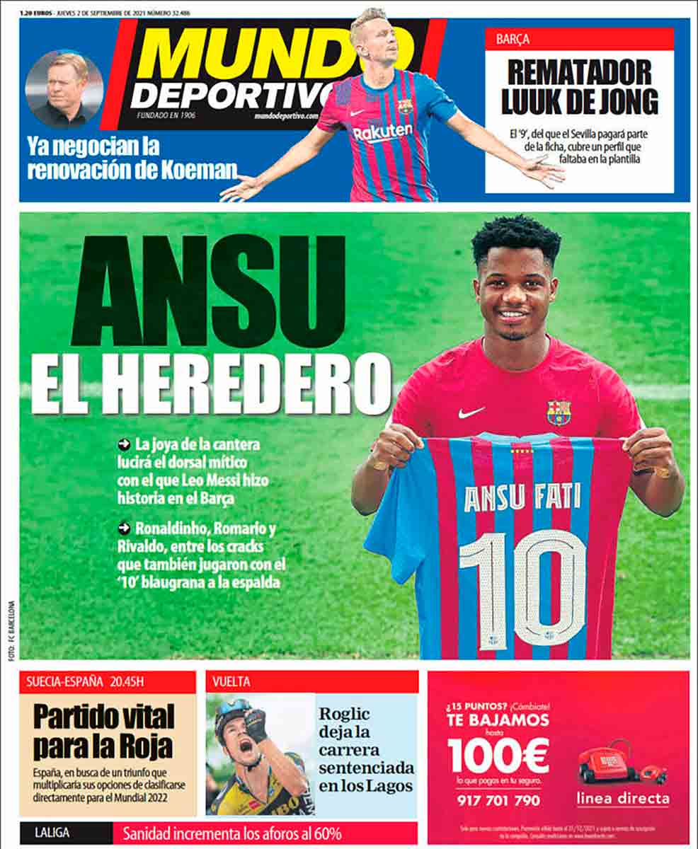 Sport y Mundo Deportivo, como es habitual, viven en su propio mundo aislado del resto y se centran en la importantísima noticia de que Ansu Fati elige el dorsal 10 de Messi. Esta noticia de portada nos recuerda a las ya acostumbradas «exclusivas» de los medios deportivos que están más cerca del folclore, que ceban a la audiencia durante horas y luego el notición es que un futbolista ha comprado guacamole del Mercadona, que aunque la verdad es que está bastante rico, no supone una primicia de interés en sí mismo.