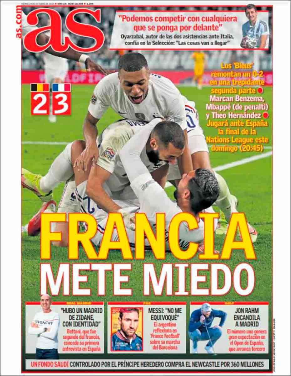 As dice que Francia mete miedo y, la verdad, no entendemos por qué. Más aún cuando en la portada aparece un feliz Benzema. Cualquier madridista se alegra de ver disfrutar a Karim, que ayer volvió a marcar un gol antológico y ya no sabemos qué más tiene que hacer para ganar el Balón de Oro.