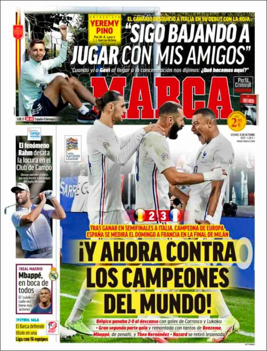 Marca también dedica su espacio principal a destacar que el domingo España y Francia (los campeones del mundo) disputarán la final de la Nations League.