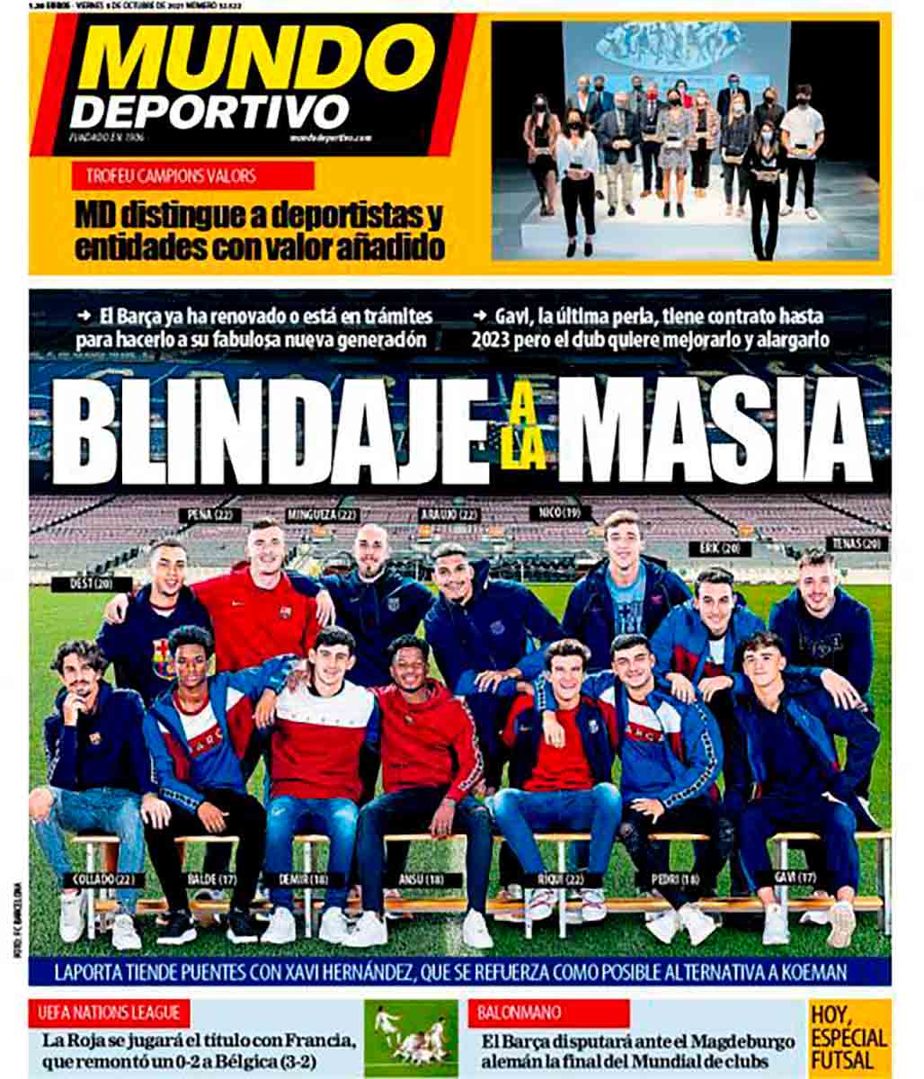 La portada de Mundo Deportivo está dedicada a la cantera del Barça, aunque bien podría estar patrocinada por una empresa de aceite. «Blindaje a la Masía» es el titular. Entendemos que cuando emplean el término blindaje se refieren al deseo de blindaje, porque el Barça aún no ha renovado a Ansu Fati, ni a Pedri, ni a Gavi y, por tanto, la Masía está expuesta al ataque de, por ejemplo, los aceites de Jaén (sin duda de superior calidad).