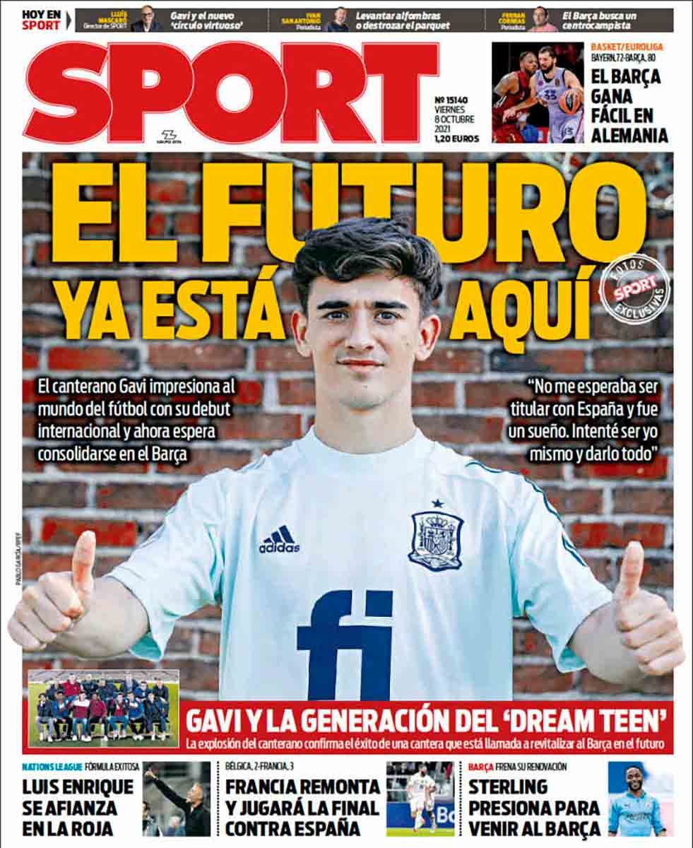 Sport ilustra su portada con una fotografía que tiene mucho mérito: han conseguido una instantánea de Gavi en la que su moflete no aparece hinchado por la lengua prominente que lo empuja desde el interior. Bien por Sport.