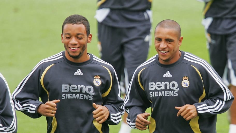 Poco a poco, el desacierto ofensivo de los locales hizo que los blancos se ordenaran a pesar del guirigay que tenían montado Roberto Carlos y Marcelo en la banda izquierda, quienes no acababan de acoplarse en su posición compartida. Cuando uno venía, el otro se iba y al revés. Por momentos, parecían Richard Pryor y Gene Wilder en No me chilles que no te veo. El caso es que así, conduciendo la pelota entre los dos con la extraña pero complementaria habilidad de un sordo guiando a un ciego, comenzaron a crear peligro en la portería de N’Kono, ante las protestas por la supuesta ilegalidad de la conducción robertomarcelista, que no iban a ninguna parte porque no había árbitro.