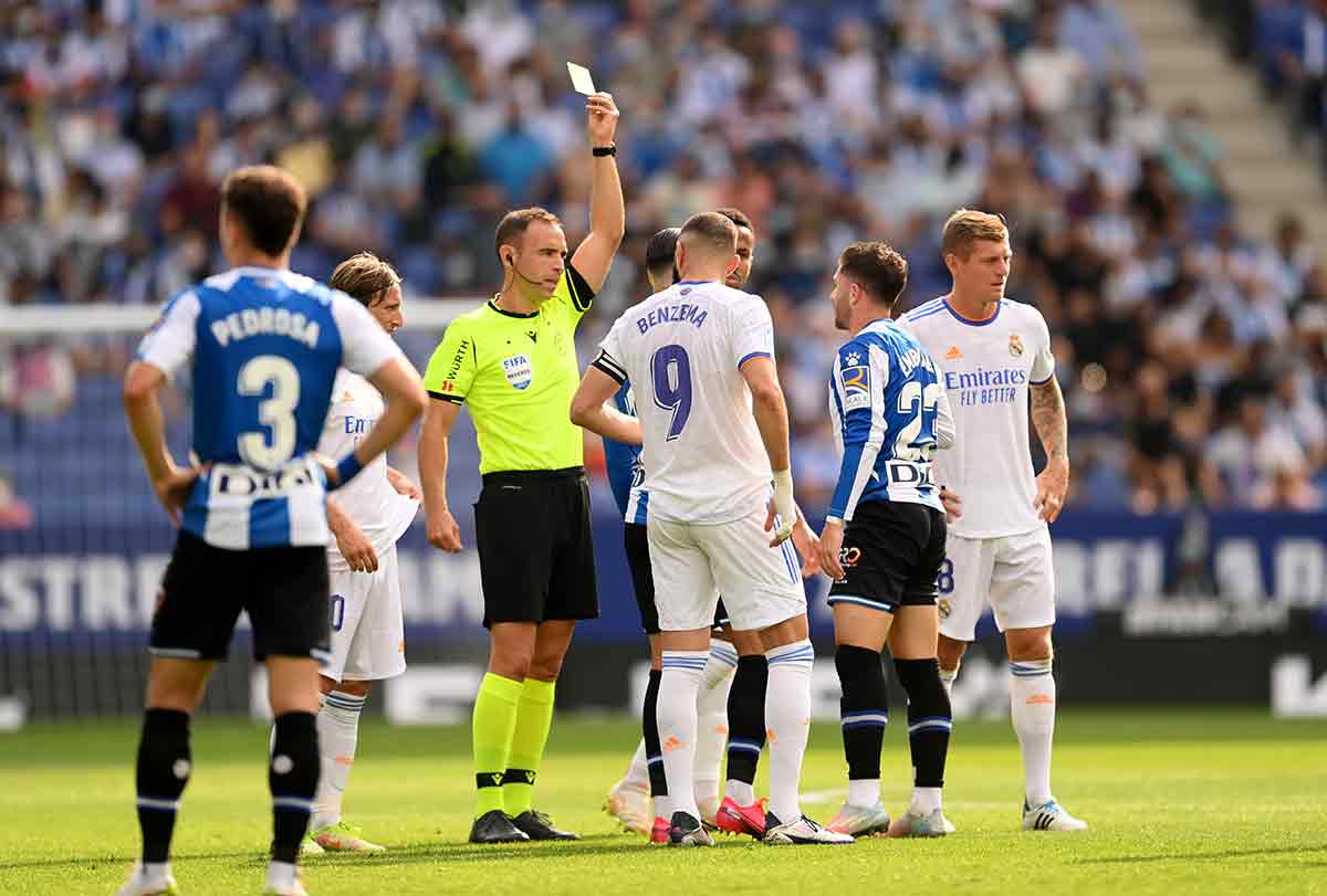 A pesar de estas dos oportunidades, lo más reseñable del inicio del partido fue que la primera tarjeta amarilla no fue para un jugador del Real Madrid, sino para Embarba por un claro pisotón a Camavinga. El jugador del Espanyol protestó de manera ostensible y los comentaristas de Movistar dieron a entender poco más o menos que la responsabilidad era de Camavinga por tener el pie donde lo tenía, porque Embarba no podía poner el suyo en otro sitio. Señor, dame paciencia.