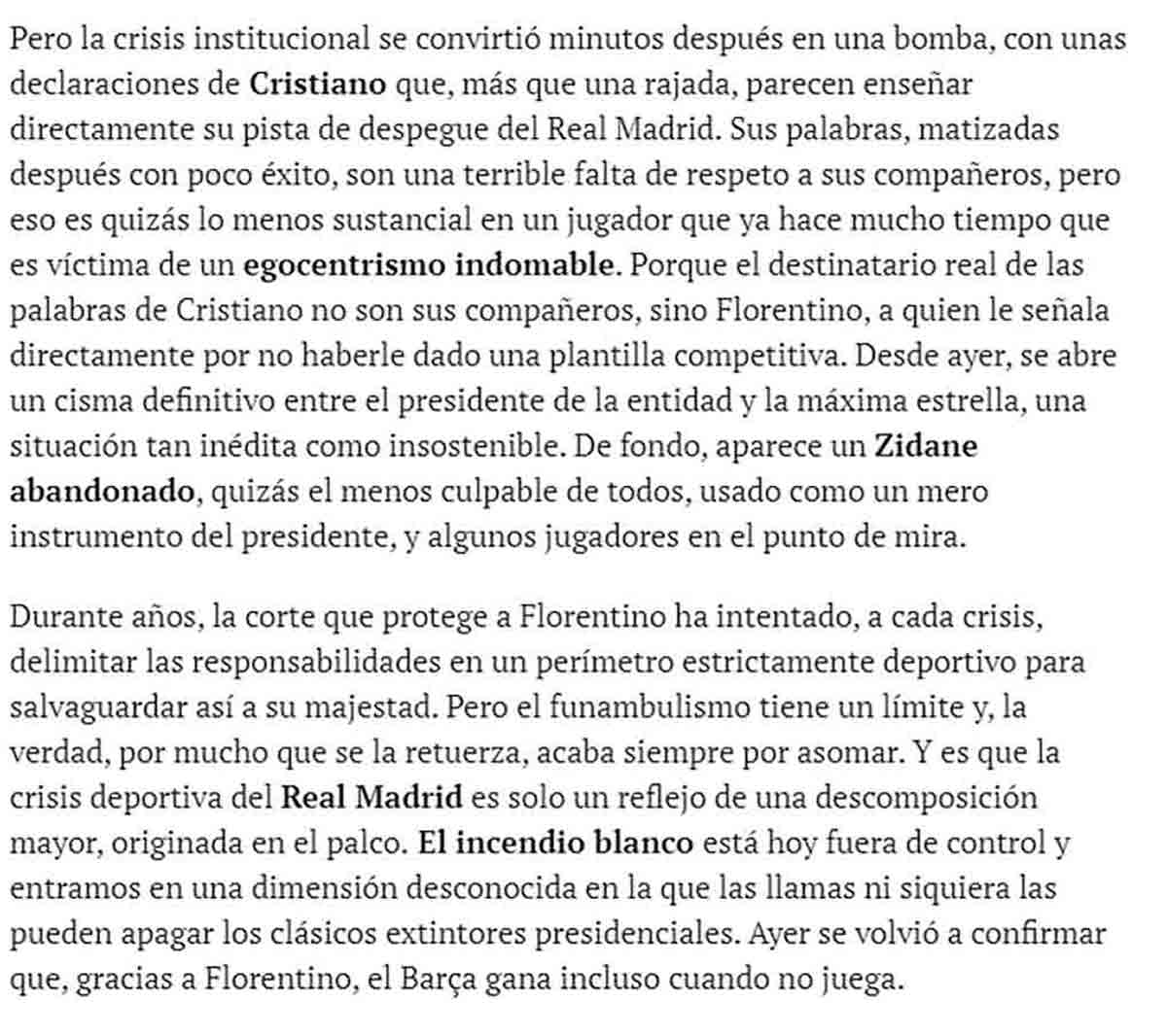 La propia portada anuncia también, en páginas interiores, editorial de Ernest Folch titulado “El Madrid, fuera de control”. Repasemos algunos extractos de aquella pieza maestra, complemento perfecto de esta lúgubre portada.