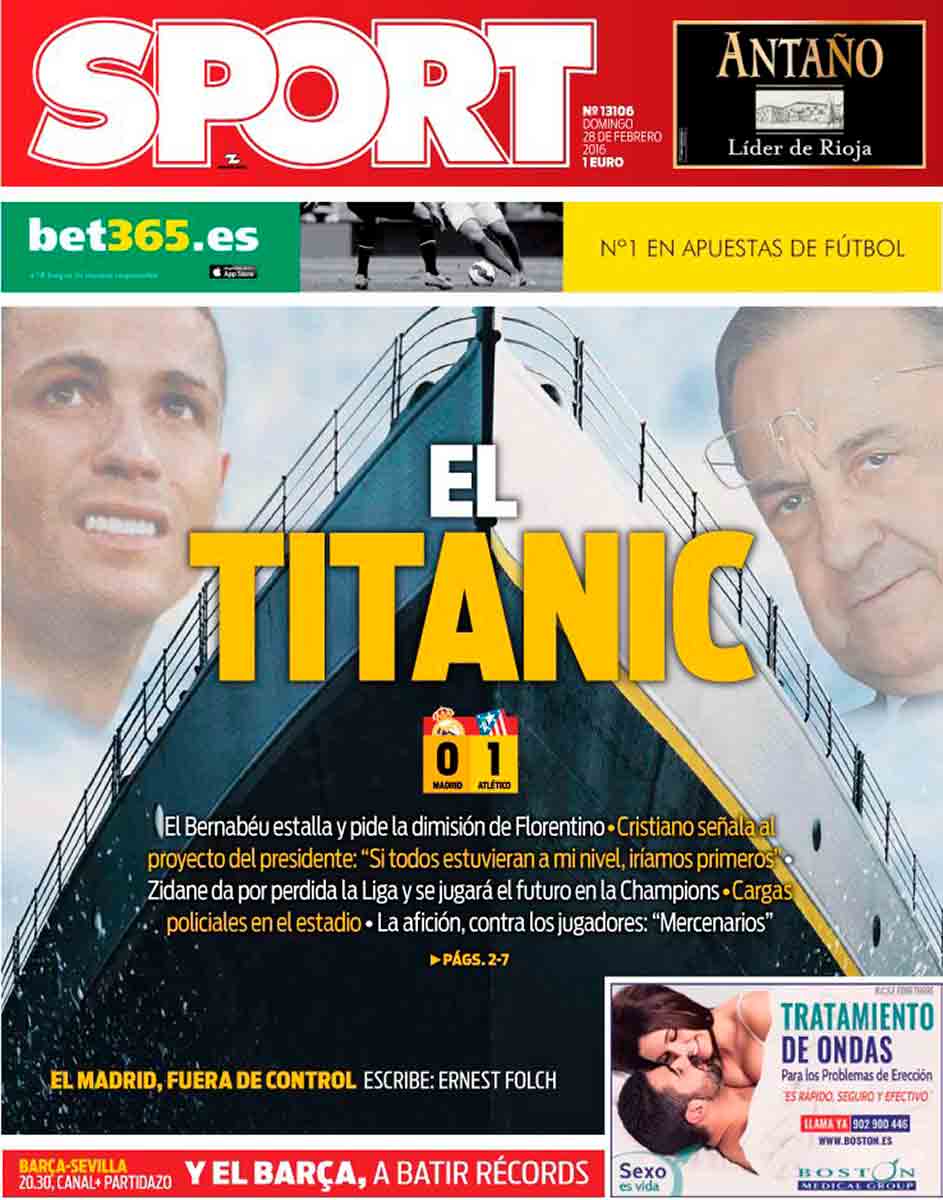 Zidane llevaba pocas semanas capitaneando el barco, acababa el Madrid de palmar 0-1 contra el Atleti y Sport decidió reflotar —nunca mejor dicho— la nave de los peores augurios para estrellarla contra el iceberg. “El Bernabéu estalla y pide la dimisión de Florentino”. El que hambre tiene con pan sueña, Sport. “Zidane da por perdida la Liga y se jugará su futuro en la Champions”. Menos mal que la dio por perdida, porque el Barça, que llegó a disfrutar de una ventaja de 13 puntos, la terminaría ganando en la última jornada a base undianomallenqueos y closgomezadas. “Cargas policiales en el estadio”, agregaba Sport, pintando un panorama apocalíptico que solo existía en su calenturienta imaginación y, si acaso, en la Barcelona de cinco años después.