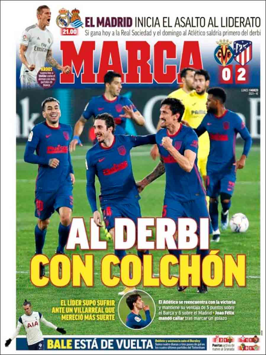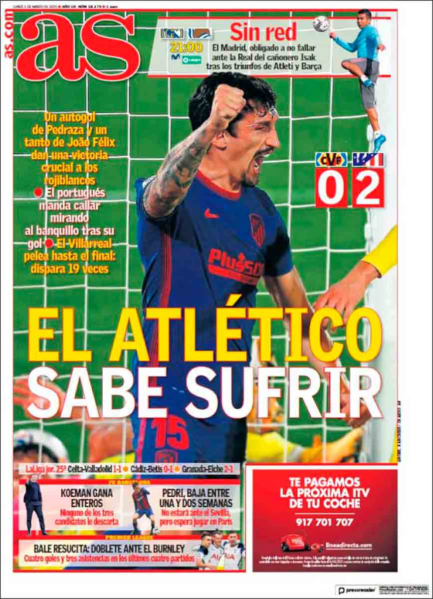 Tanto Marca como As, por su(s) parte(s), nos instruyen acerca de la cholistísima victoria del Atleti en Villarreal. Raro raro raro el primer gol colchonero, con Savic colgándose de la chepa de un defensa amarillo y el balón entrando después de 74 rebotes y medio, los mismos que daría el esférico sobre la línea de la otra portería un rato después, pero esta vez sin llegar a entrar. Fueron determinantes en la victoria de los de Simeone tanto la suerte como la actuación del trencilla De Burgos Bengoetxea, quien no solo no es de origen burgalés sino que tampoco tiene parentesco alguno con el editor de este vuestro portal, diga lo que diga la maledicencia.