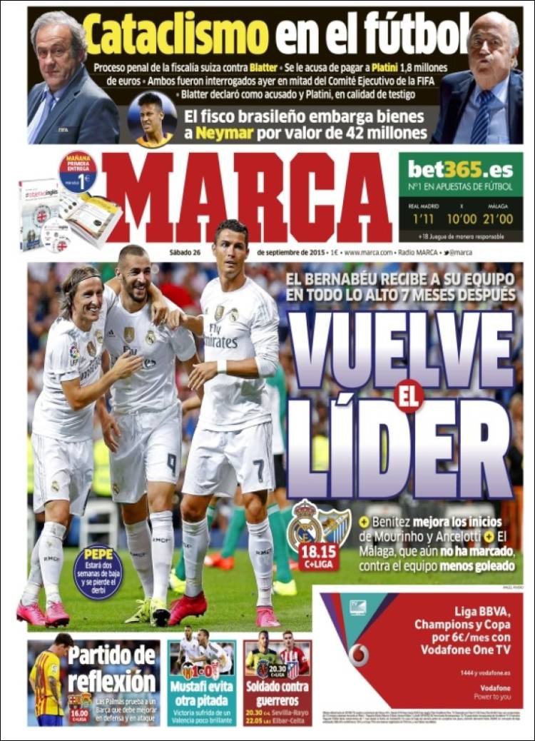 El yin y el yang, el blanco y el negro, el día y la noche, el calor y el frío, el Madrid líder y Blatter procesado. En esta polaridad se mueven las portadas deportivas de hoy, si descontamos el ejercicio de cinismo que plantean los medios catalanes y la fiebre del sábado noche a la que invita un desatado y viril diario As, capaz aún de sorprendernos.