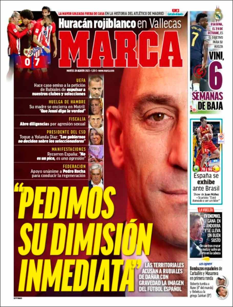 Marca dedica una pequeña reseña: «Huelga de hambre. Su madre se encierra en Motril. ‘Que Jenni diga la verdad’». Pero el espacio principal es para las territoriales de la RFEF, que acusan a Rubiales de dañar con gravedad la imagen del fútbol español y exigen su dimisión.