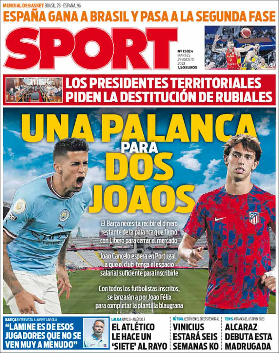 Mundo Deportivo y Sport, al igual que sus compañeros madrileños, se hacen eco de la victoria de la selección española frente a Brasil y el pase a la segunda fase del Mundial de baloncesto, buena noticia, pero su espacio principal lo dedican a las que dicen será las próximas incorporaciones del Barça: Cancelo y Félix.