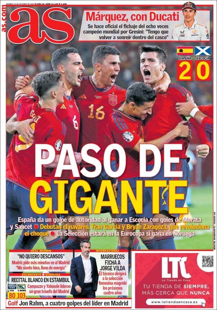 Pero ¡un momento! As otorga algo más de espacio al Madrid de los canastos y además con exclusividad (“Recital blanco en Estambul”), pero el espacio sigue siendo ridículo. Lo que llama la atención es que para referirse a España han optado por un titular idéntico al de Marca (la foto de la celebración del segundo gol es ligeramente distinta). No es la primera vez que As y Marca coinciden en el mismo titular, lo que vuelve a desatar en nuestras mentes conspiracionistas la teoría de que hay un topo de As en la redacción de Marca. Y/o viceversa.