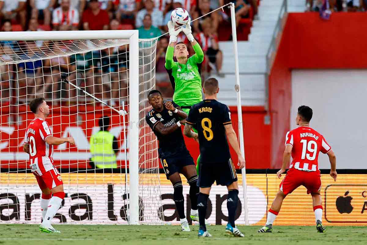 Este verano en los mentideros se decía que a Ancelotti no le gustaba nada, que el club quería largarlo, que no tenía brazos, que estaba fichado David Soria, un veterano de garantías y por lo demás, barato. En fin, que era otro juguete roto tirado por los dioses caprichosos en el umbral del edén, cuya entrada, como a todos los abortos de la gloria que hubo antes que él, se le vedaba, hasta que una tarde de agosto Courtois se rompió la rodilla y el panorama cambió del todo. En Almería, aún más que en Bilbao a pesar de recibir un gol, Lunin ofreció una sensación de seguridad tan redonda como no lo había hecho antes. Atravesó la niebla de las dudas con dos estiradas a lo Zamora en la final del 36 en las que el aficionado pudo ver por fin el guardameta de tremenda envergadura que se anunciaba hace seis años, cuando el Madrid lo trajo sin ruido de un país en guerra. Luego blocó bien por alto y dominó córners y balones en diagonal sobre su negociado, fluyó con el balón en los pies y actuó con la serenidad propia de los titulares del Madrid, un poco de eso que Bellingham, después, con los periodistas, reconoció que le ha impactado mucho al verlo desde dentro en su llegada al vestuario del Madrid: la mirada de las mil yardas, al final de la cual hay un infierno en el que arden sus rivales.