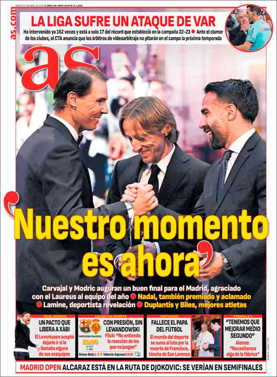 Tanto Marca como As escogen hoy como argumento principal de sus portadas los Premios Laureus, prestigiosos galardones del mundo del deporte cuya gala tuvo lugar ayer en la capital. Junto a un merecidísimo premio a la trayectoria de Rafa Nadal, recogieron también sus estatuillas atletas como Mondo Duplantis y Simone Bilis. En lo estrictamente futbolístico, Lamine Yamal fue premiado también. Merece reconocimiento su calidad, que es mucha. Lo que nos preguntamos, habida cuenta de la cantidad de galardones y portadas de periódicos que ocupa el chaval, es hasta dónde llegará el hype el día que por fin logre algo importante con su club, cosa que aún está por verse.
