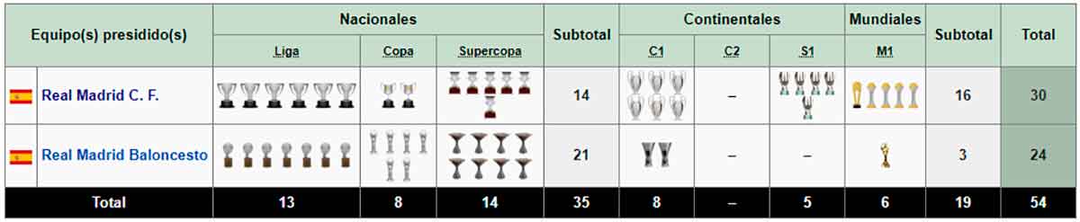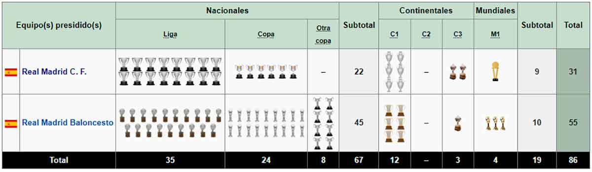 Arrodillaos, pecadores, estáis ante el Santo Grial del deporte. Ningún presidente se acerca a estos números: 12 Copas de Europa, 35 Ligas, 24 Copas, 4 Intercontinentales…