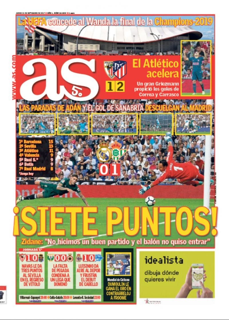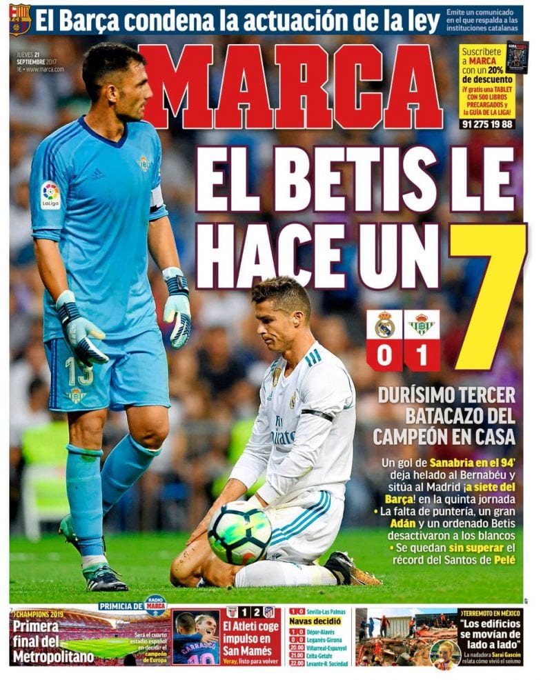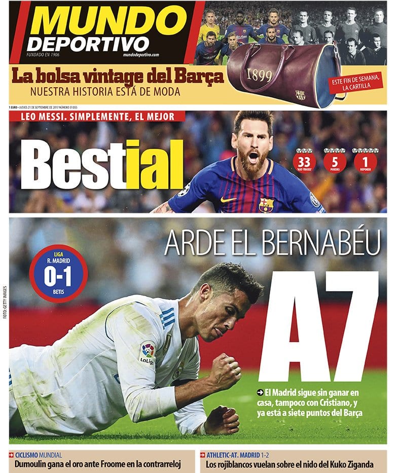En Madrid la prensa deportiva hoy se ha dejado el coco. Ambos destacan con muchos colores y exclamaciones el cómodo colchón de ventaja de siete puntos del Barcelona apenas transcurridas cinco jornadas de Liga. Se trata de un curioso fenómeno dado que el culerío esperaba el llanto y el crujir de dientes tras el jakuzzi del que fueron provistos no hace tanto en la Supercopa de España.