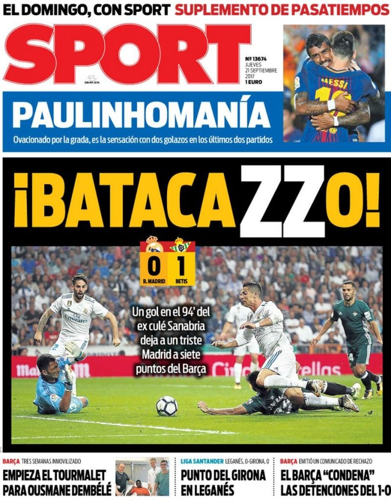 Mientras tanto en Matrix, entre Coutinhos, Dembeles, Neymar, Papá Neymar, el procés y el baño supercopero andaban con tal congoja que las buenas nuevas que les llegan de la meseta han desatado una euforia tal, que en Canaletas hay quien confunde a los de la CUP con el culerío. “BatacaZZO” titula ufano Sport en un intento gráfico de mofarse de Monsieur Zinedine Zidane, aquel que ha ganado un porrón títulos en seis meses. Try again.