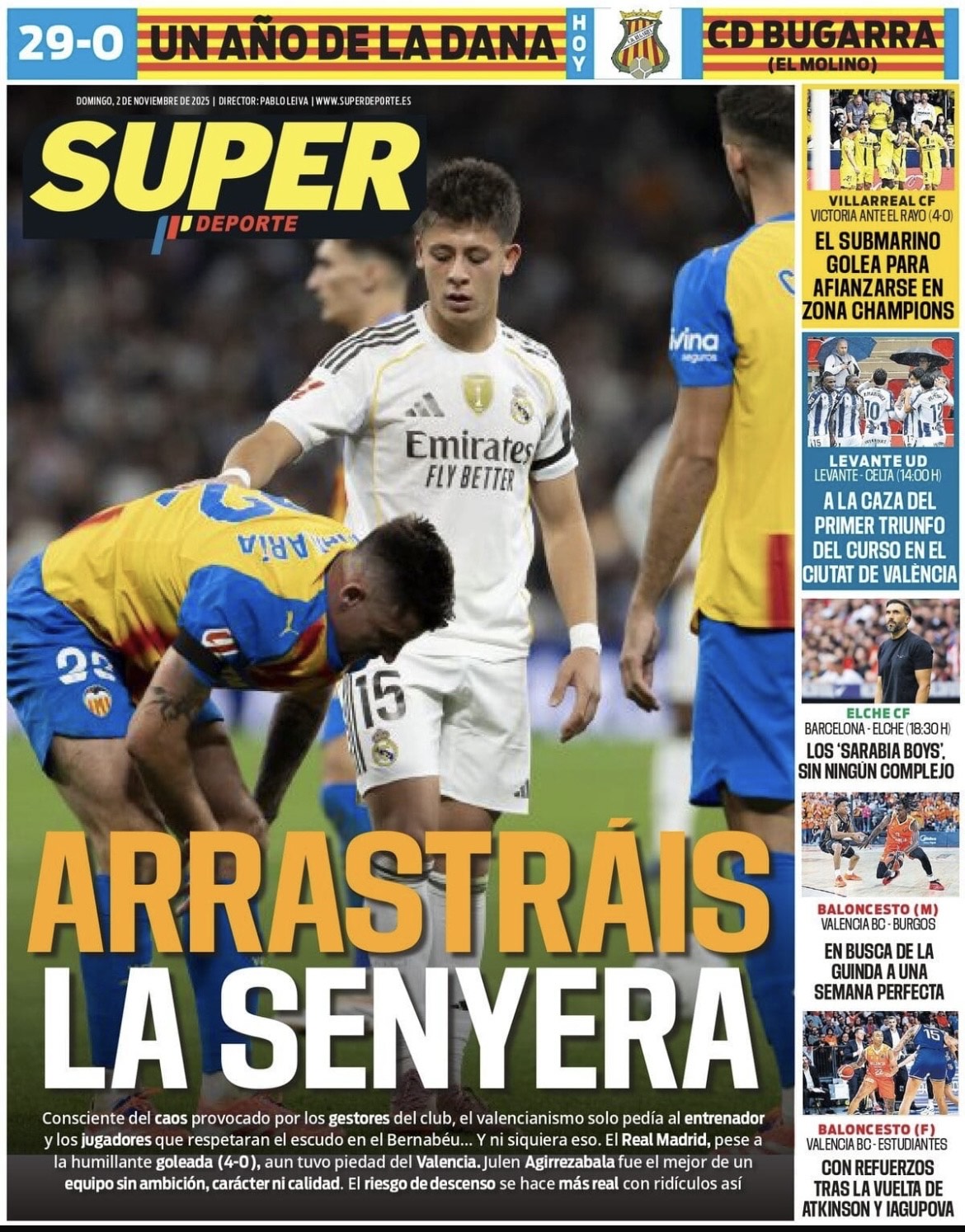 El eximio rotativo valencianista Superdeporte, generalmente reconocido (?) por sus libelos contra la entidad de Concha Espina y su indisimulado racismo contra Vinicius, hoy no tiene argumentos más que para girarse sobre sí mismo y lanzarse al surco de las afirmaciones gruesas contra su propio equipo, al que como veis acusan de “arrastrar la senyera”, o sea, poco menos que de ultrajar la bandera de la región que representan.