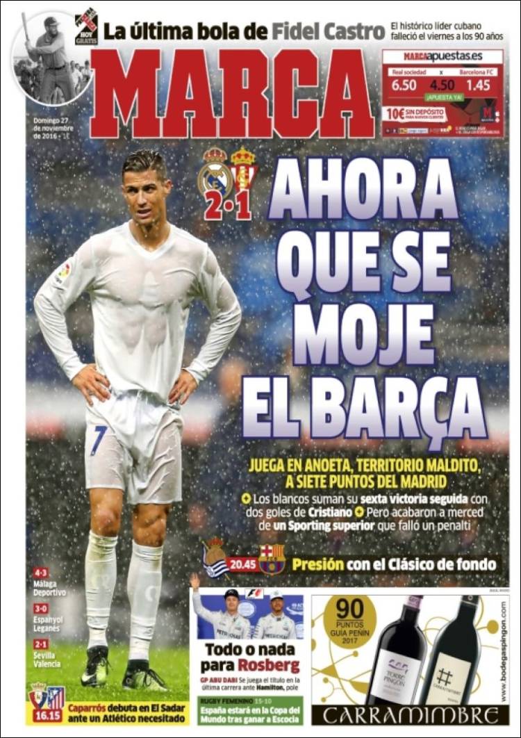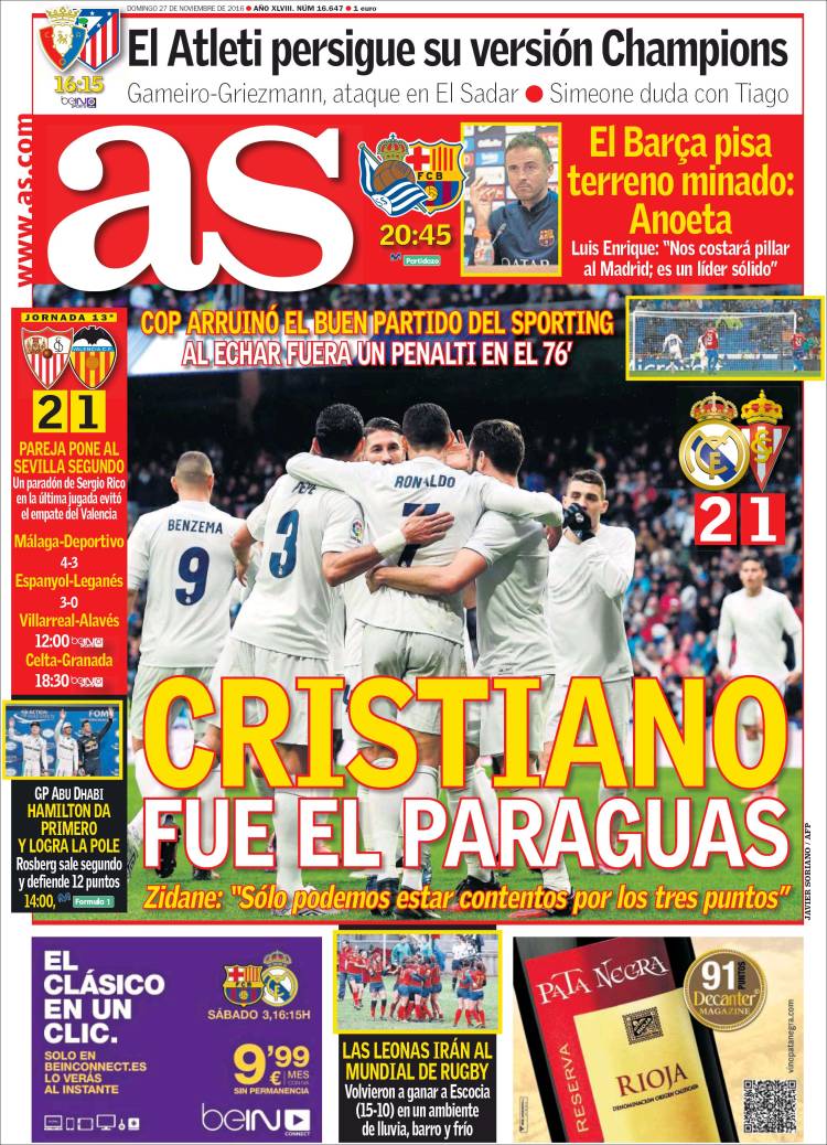 El diario As es uno de esos expertos y analistas. Su portada está deseando decir lo que solo puede decir a medias, que es la mejor manera de que se note que se muere por ser más explícito a voz en grito. El penalti que falló Cop ayer bajo la lluvia madrileña (que "arruinó el buen partido del Sporting", nada menos) se convierte en el verdadero protagonista, ya que, menuda lástima, de haberlo metido era una ocasión inmejorable para poder hacer hoy una portada de esas que tanto gustan a Relaño, de esas que tan bien saben hacer, de esas que los buenos resultados del Madrid de Zidane apenas les permiten hacer sin caer ya directamente en el delirio. El Madrid jugó mal, pero ganó, mecachis. El Sporting falló un penalti con el que tantos salivaban, caca culo pedo pis. Cristiano marcó dos goles y lleva cinco en una semana. Malos tiempos para el apocalipsis.