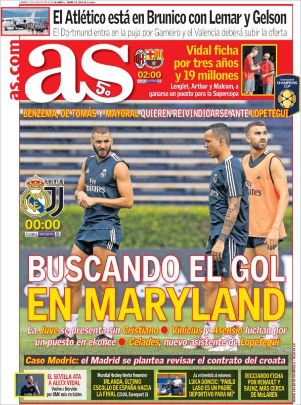 "Buscando el gol en Maryland". Se conoce que a Relaño se la acabó la creatividad literaria en la metáfora del océano, lo que desemboca en este titular de serie B o Z para un partido que, no nos engañemos, tampoco es de primera fila, aunque servirá para que echen a rodar los primeros cimientos del proyecto de Lopetegui, proyecto al que (queremos pensar, pese a lo que se desliza desde el propio club) le queda alguna que otra pieza por incorporar. Marca también trae a portada el partido que se juega hoy (o ya mañana) a las doce de la noche, y lo hace de una manera no mucho menos ramplona.