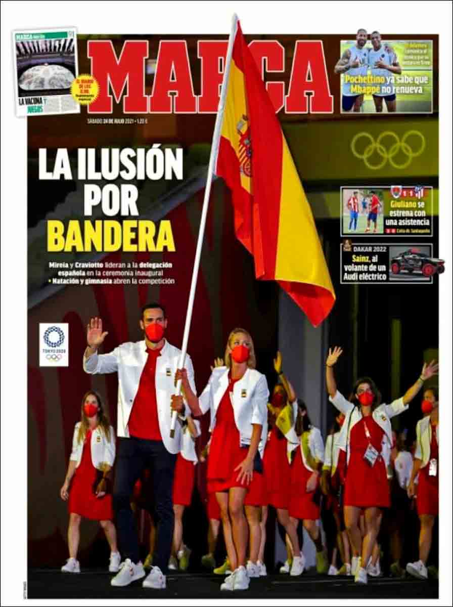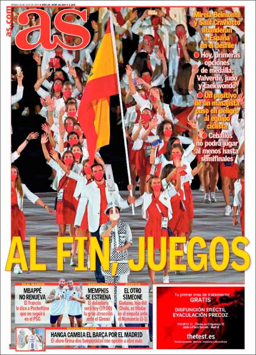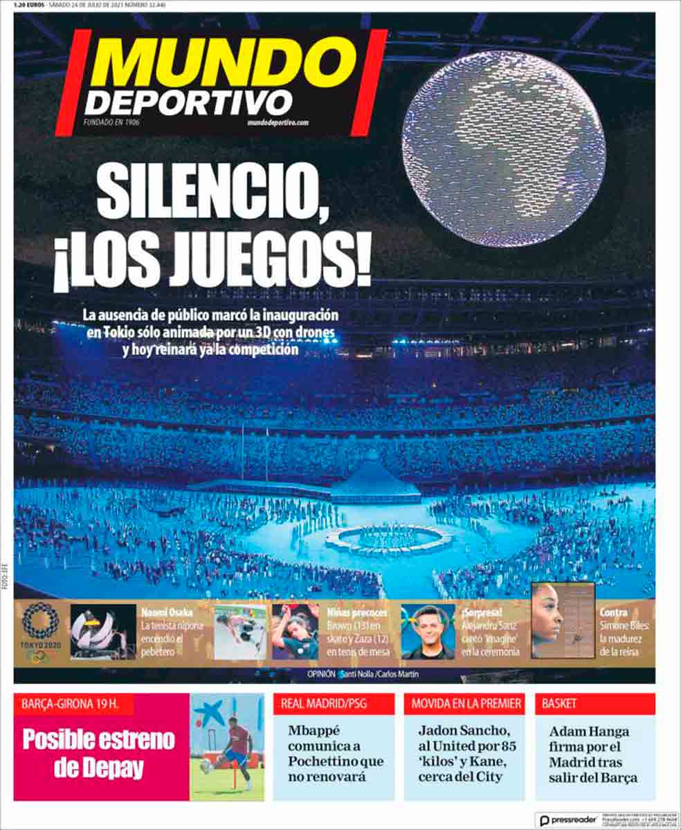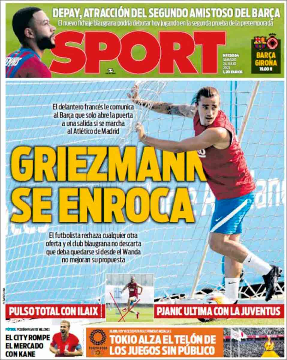 Buenos días. Han comenzado los Juegos Olímpicos con desigual tratamiento en nuestras queridas portadas deportivas. O mejor, la ceremonia inaugural de dichos Juegos es noticia central en tres de las portadas y ocupa un lugar residual en la primera plana de Sport, porque no en vano Tokio está muy lejos y Griezmann muy cerca; aunque no sabemos si cerca de salir del Barça, cerca de quedarse o cerca de hacer otro reportaje con Piqué sobre lo lejos que está Tokio y lo cerca que está la actualidad culé del ridículo y el esperpento.