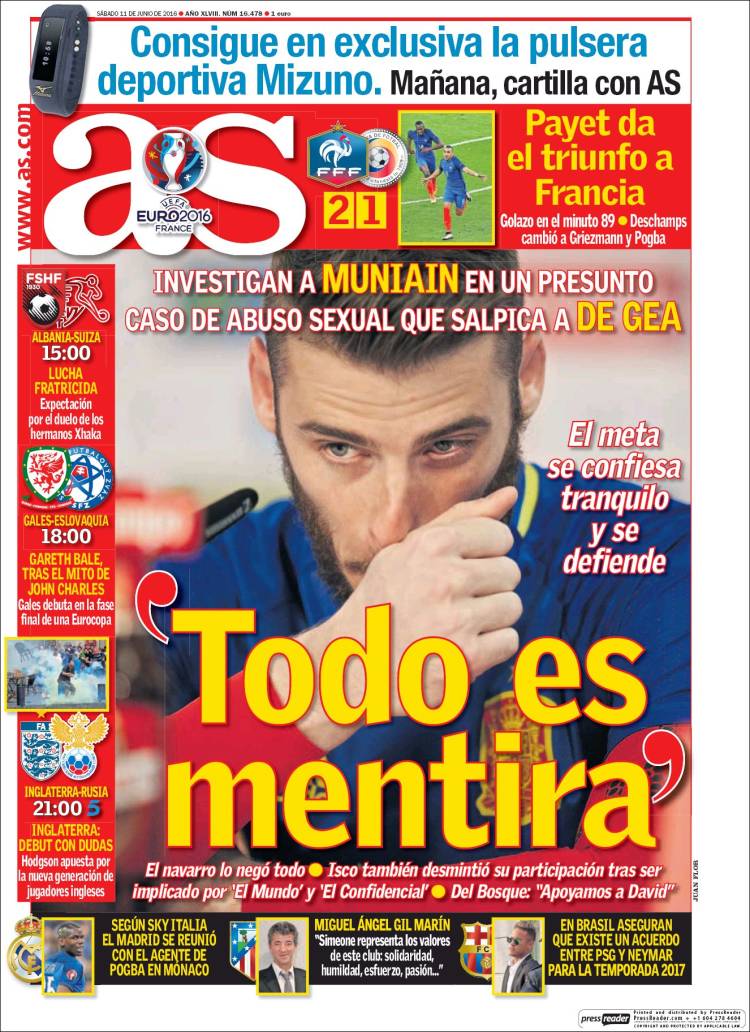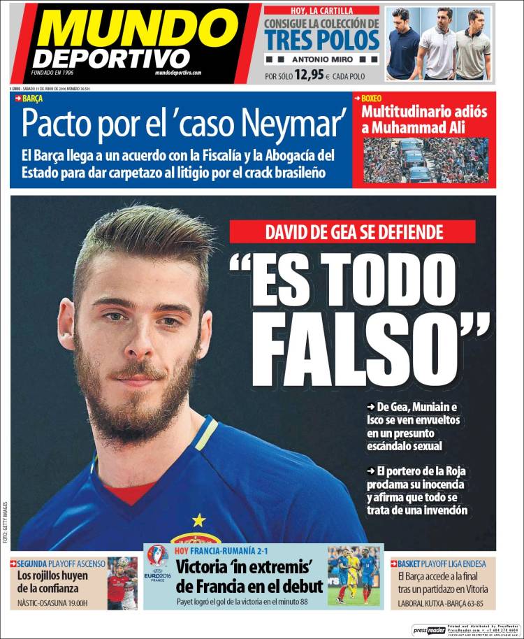 Ya lo ven. Unanimidad en el tema principal de As, Marca y Mundo Deportivo, y no es para menos. Como decimos, el asunto es grave, aunque esté aún por determinar su veracidad. Por ahora, la posible implicación de De Gea, Muniain y algunos medios han dicho que también Isco en un turbio asunto de abusos sexuales tiene que ver con la declaración de una testigo protegida, declaración que debe ser refrendada o desestimada legalmente antes de que nadie emita juicio alguno. O eso sería lo ideal, es decir, eso que por lo general no suele ocurrir en estos casos y aun en otros de menor escándalo.
