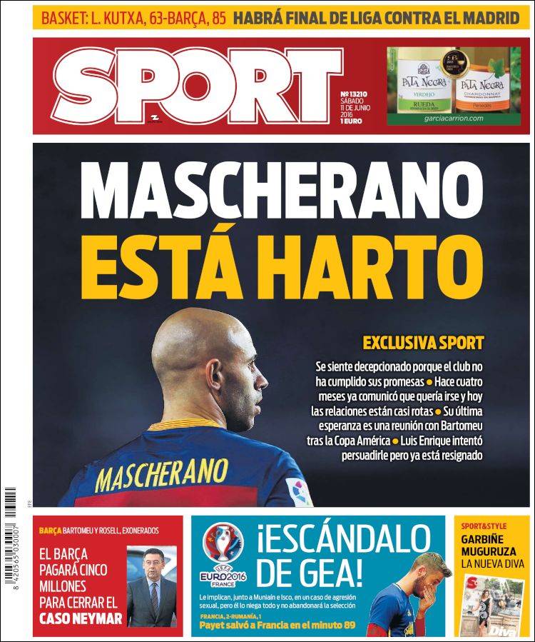 El tema que nos viene ocupando sí tiene su hueco en la portada de Sport, pero es un hueco más bien pequeño en comparación con la relevancia de la noticia, y cosa aún más grave, forma parte de la sección que incluye la información sobre la Eurocopa, como si pertenecieran al mismo ámbito de la realidad el gol del francés Payet en el minuto 89 y los presuntos abusos sexuales, agresiones y amenazas en los que podrían estar implicados algunos futbolistas españoles. Un mínimo análisis periodístico convierte en ilegítima la portada de Sport, pero también un mínimo análisis ético, y más si atendemos al titular elegido, un exclamativo "¡Escándalo De Gea!" que roza (o cae de lleno) en el amarillismo más pernicioso.
