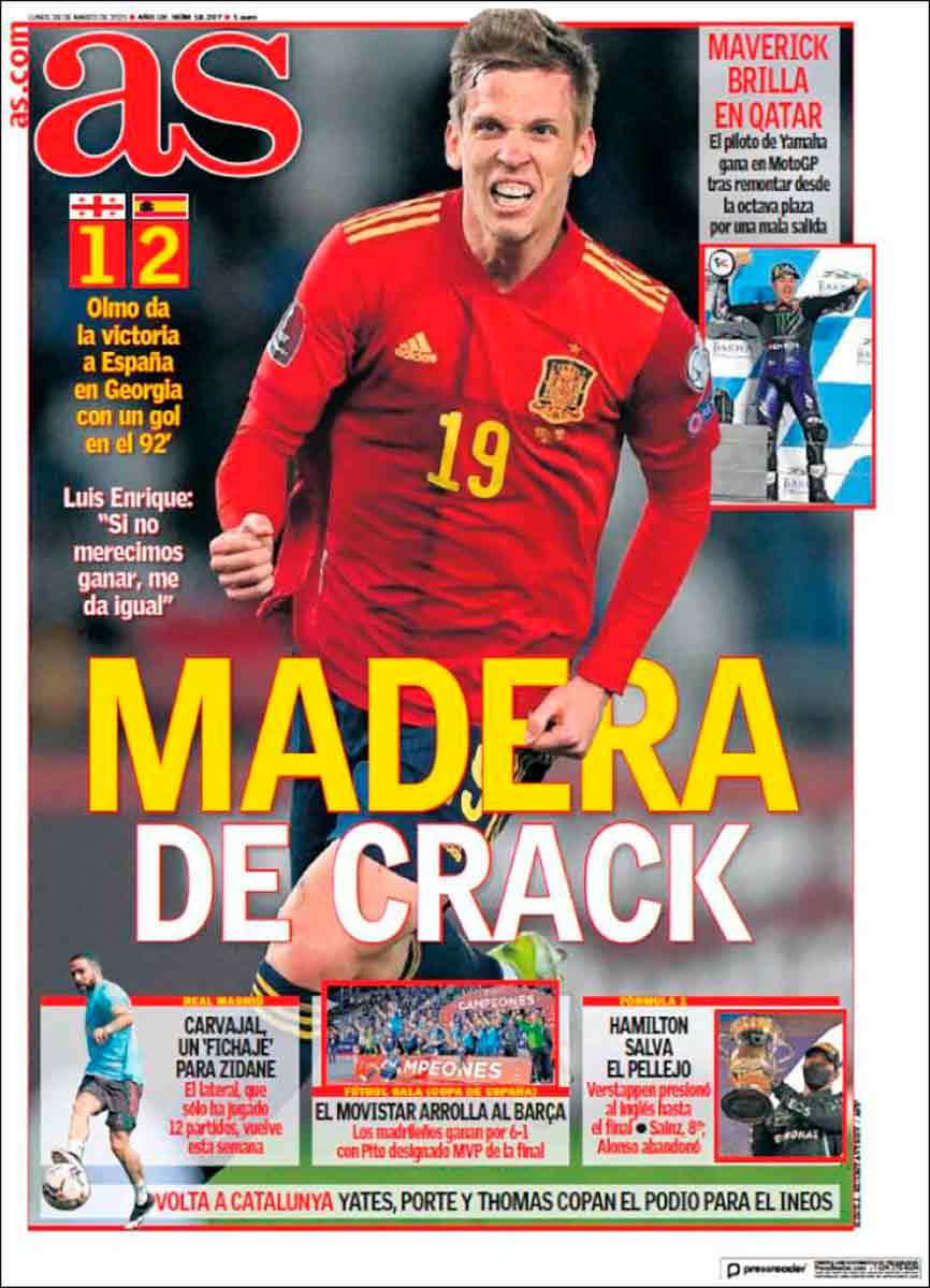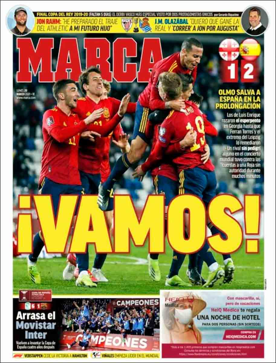 Esta victoria, que fue agónica, es el argumento principal de todos los periódicos del día, y en ellos se cuela también, subrepticiamente, la humillación sufrida por el FC Barcelona de fútbol sala a manos del Movistar Inter, que le propinó un 6-1 digno de deporte más mayoritario en la Final de la Copa de España.