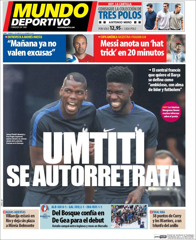 Un somero vistazo a las portadas deportivas de hoy nos hace pensar que la Eurocopa se juega más en Madrid que en Barcelona, donde en realidad se juega el mismo partido de siempre: uno entre nubes de azúcar en un país multicolor donde hay un Messi bajo el sol. En realidad la Eurocopa se está disputando en Francia, aunque están dando más que hablar las peleas entre descerebrados de diversa procedencia que el mero fútbol. Entre estos dos extremos pivotan hoy las portadas madrileñas, entre el fútbol y esas barbaridades anexas, que a ver si se enteran los cafres, no tienen nada que ver con lo que debiera ser la rivalidad bien entendida.