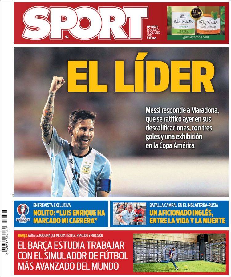 Ya decíamos que en Barcelona hay Eurocopa ma non troppo, porque sepan que también hay Copa América, y en ella juega sobre todo Messi, quien anotó un hat-trick contra Panamá para, acto seguido, quedársele el peculiar gesto que luce (?) en la portada de Sport. En Argentina aún se preguntan por el liderazgo de Messi, Maradona a la vanguardia de la cuestión, pero en la prensa culé obviamente no tienen ninguna duda y titulan "El líder". No descarten que ser culé faculte también para ser más argentino que los argentinos, porque ser culé es algo omniabarcante, porque el patio de mi casa es particular y yo lo amplío y lo coloco donde me da la real (con perdón) gana.